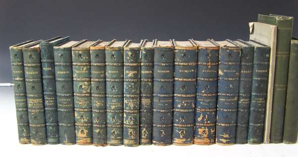 The works. Orpington: G. Allen, 1883. 11 volumes, 8vo, presentation copy, inscribed "Florence Harriette Isabella Druce, her name gratefully inscribed, by John Ruskin, Brantwood, 27th Sept. 1884"; Idem Arrows of the chace. 1880, 2 volumes; Idem Praeterita. 1886-1900. 3 volumes; Idem Deucalion. 1891; Idem Fors clavigera. 1890. 4 volumes; Idem The stones of Venice. 1884. 2 volumes; Idem The seven lamps of architecture. 1883; Idem The art of England. 1884; Idem The storm cloud of the nineteenth century. 1884, all matching blue calf; mostly rather rubbed; and 16 others by Ruskin; and a 4 folio page manuscript account by Florence Harriette Isabella Druce of her visit to Ruskin and stay at Brantwood, 25 Sept. - 19 Oct. 1884