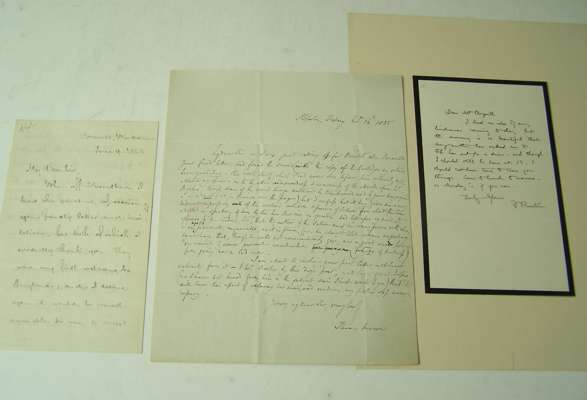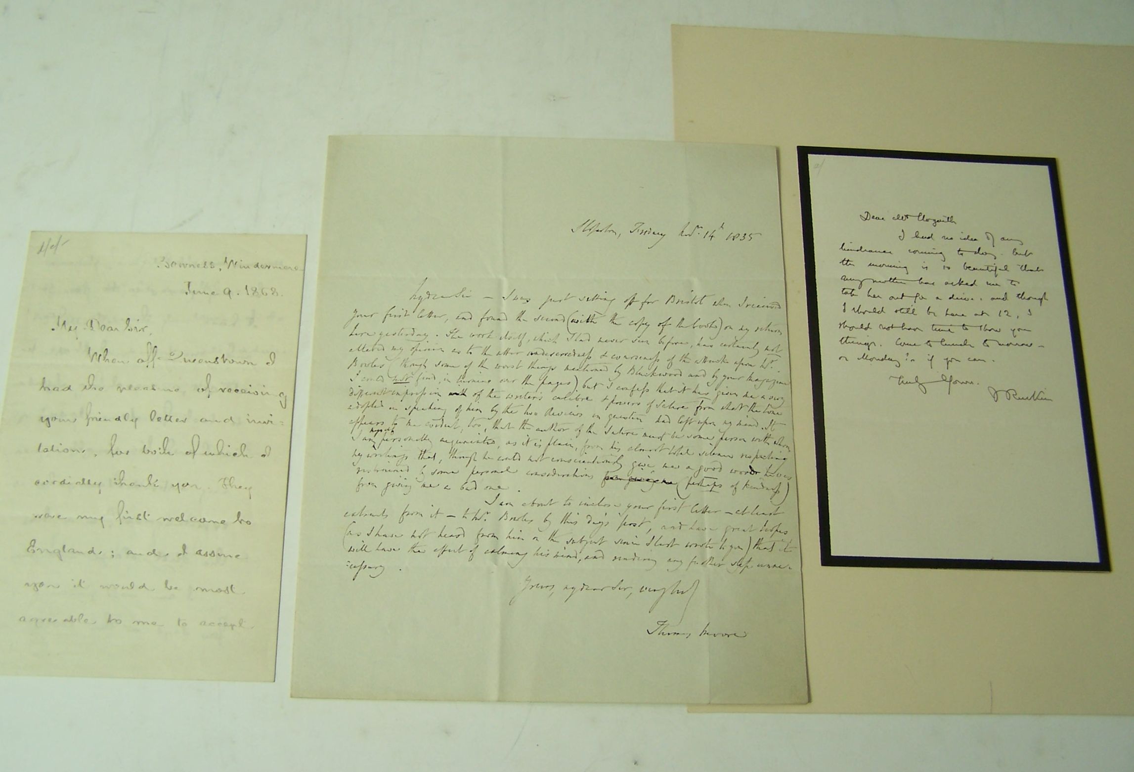Moore, Thomas. A.L.S.to William Pickering the publisher, one page, 14 November 1835, referring to "the utter indiscreteness & coarseness of the attack upon Mr Bowles (though some of the worst things mentioned by Blackwood and by your magazine I could not find in... the pages), but I confess that it has given me a very different impression of the writer's calibre & powers of satire from what the tone adopted in speaking of him by the two Reviews in question had left in my mind.", speculating that the author of the satire must be a personal acquaintance of his seeing "his almost total silence respecting my writings", integral address leaf; Longfellow, H.W. A.L.S. discussing his arrival in England, 3 pages, 9 June 1868; Ruskin, John A.L.S. to Mr Hogath, deferring lunch, undated (3)