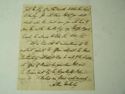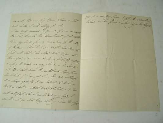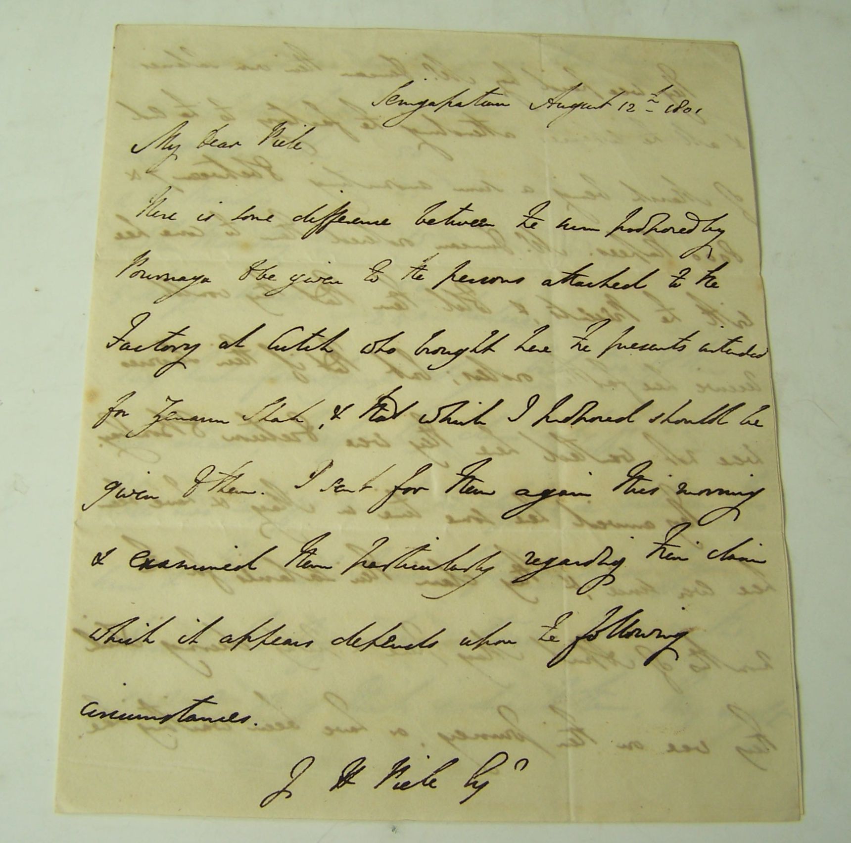 Two A.L.S.: , one to J.H. Piele, "My dear Piele" referring to "some difference between the sums proposed by [?}Poursaya to be given to the persons attached to the factory at Cutch who brought the presents intended for Zenam Shah and that which I proposed should be given to them", detailing the payments "they had formerly 7 sepoys but two of them are dead", requesting a report on the "complaint against the officer who shot the horse" and when he went to the Carnatick, stating that "no officer of pioneers has gone down that road. The Pioneers went by the Gurzethathy Pass", signed "Arthur Wellesley", 4 pages, 4to, Seringpatam, 1801; [Idem] A.L.S., discussing an appointment, 3 pages, 4to, Paris, 1 November 1815 (2)