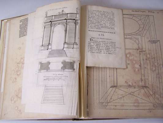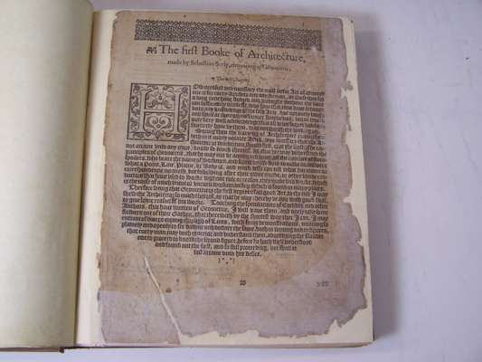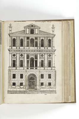 The first [-fift] booke of architecture... translated out of Italian into Dutch,and out of Dutch into English. London: Robert Peake, 1611. First English edition, folio, woodcut illustrations throughout, woodcut initials and header pieces, book one lacking title, next leaf and final blank, book two lacking folio 26?, book three folios 26 & 27 misbound, book five lacking folios 9 -12, mounted on stubs throughout, approx first 80 leaves silked and some others later on, some leaves trimmed [touching headlines], staining and browning throughout, some worm damage; [bound with] [Bartoli-Scamozzi, Ottavio] Il forestiere istrutto nelle cose piu' rare di architettura... della citta di Vicenza. Venice: Vendramini Mosca, 1804. Second edition, 8vo, 36 engraved plates [mostly folding], text and plates mounted on guards and interspersed throughout the first work, bound together in modern brown cloth gilt. Sold not subject to return.