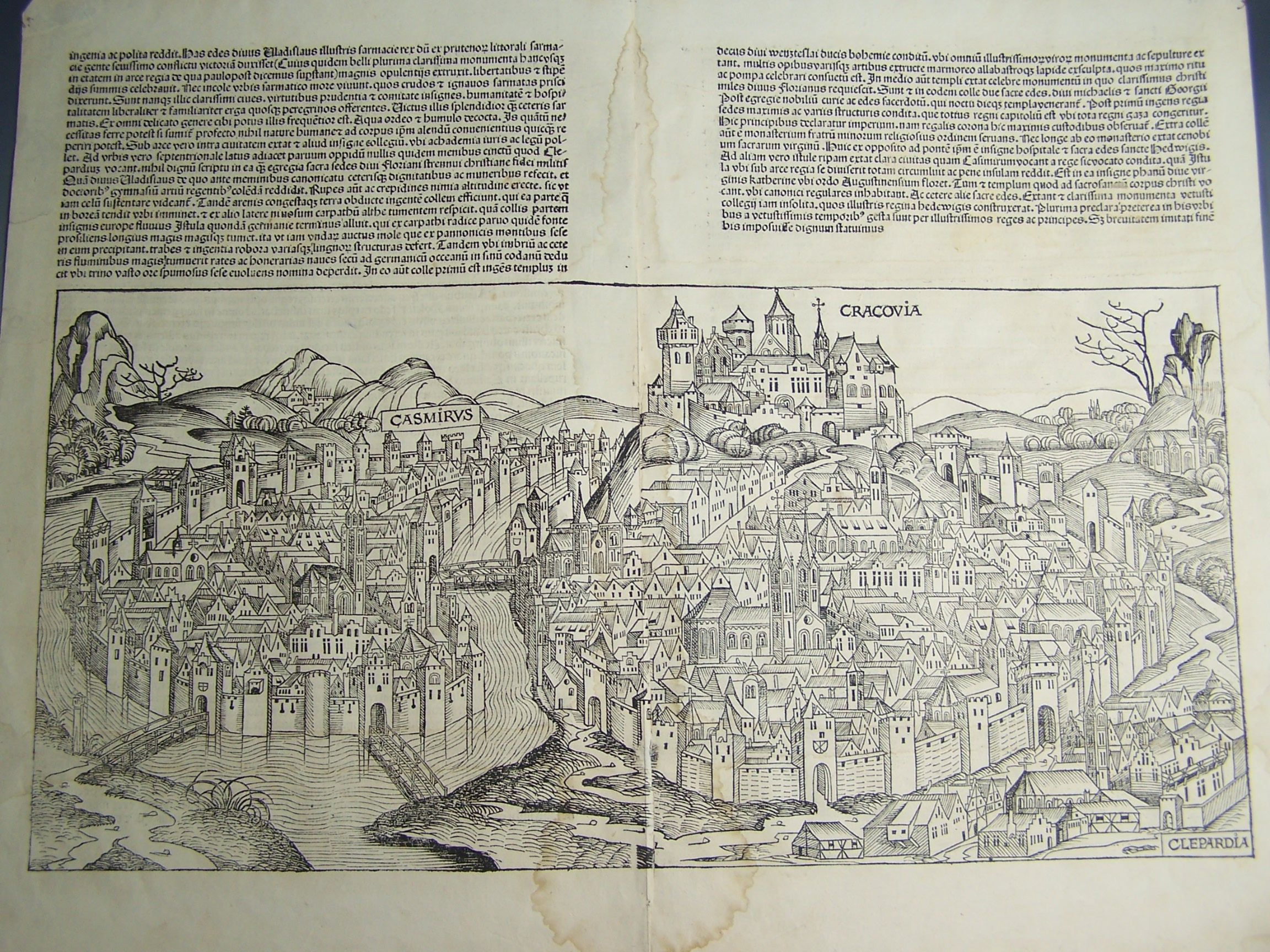 Cracovia. [Nuremberg: 1493], 36.5 by 52cm., double-page perspective woodcut view of the city with Latin text above, from the Nuremberg Chronicle, waterstaining at fold, torn at fold, some worming to edges