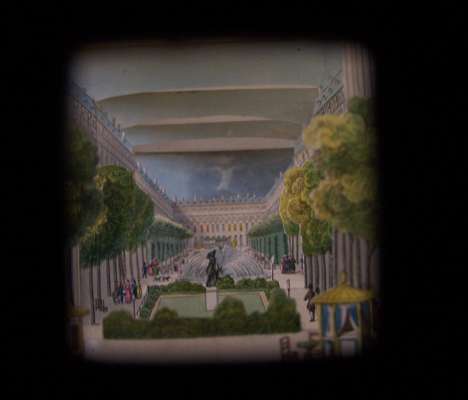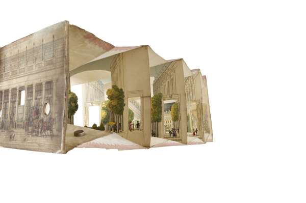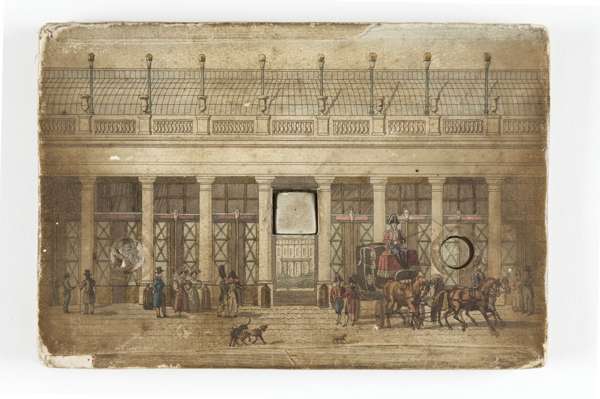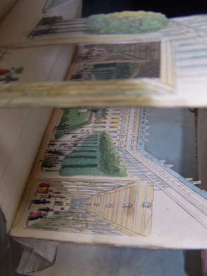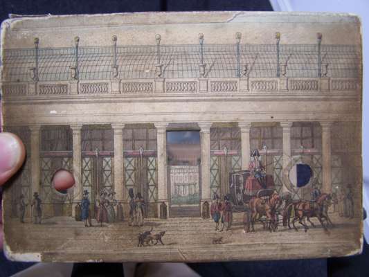 Hand-coloured engraved peep-show of the Petit Palais, Paris, comprising six sections, 128 x 190mm., [c.1840 ?], paper label on back of Werner, Md. Papetier, Rue Vivienne No 2 bis, Paris, upper section slightly soiled