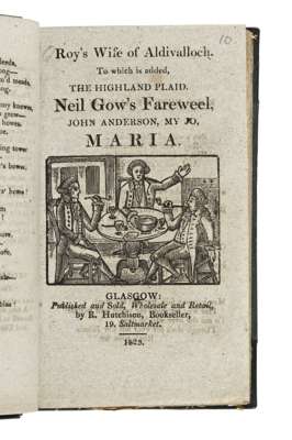 Four popular songs. Stirling: E. Johnstone, [n.d.]; The pack's address. [No place or date]; The disappointed lover. Stirling: W. Macnie, 1825; The sailor's tragedy. Stirling: W. Macnie, 1825; Tullochgorum. Glasgow: R. Hutchison, 1823; The year that's awa. Glasgow, 1829; The woodpecker. Stirling: W. Macnie, 1825; The village sexton. Glasgow: R. Hutchison, 1823; Roy's wife of Aldivalloch. Glasgow: R. Hutchison, 1823; Young Lochinvar. Glasgow, 1828; Hurrah for the bonnets of blue. Glasgow, 1829; A new song called Auld Scotia free. Airdrie: J. & J. Neil, [n.d.]; He comes from the wars. Glasgow, [n.d.]; Four excellent songs. Stirling: E. Johnstone; and 31 others, similar, some with woodcut on title, bound in one volume, contemporary green half morocco gilt