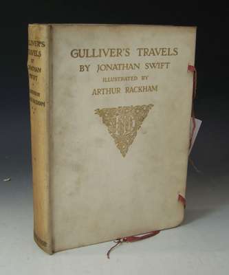 Gulliver's travels into several remote nations of the world. London: J.M. Dent, 1909. 4to, number 724 of 750 copies, signed by Rackham, 13 tipped in colour plates, original cream cloth gilt with ties, discolouration to backstrip, some soiling to boards, interior clean and bright