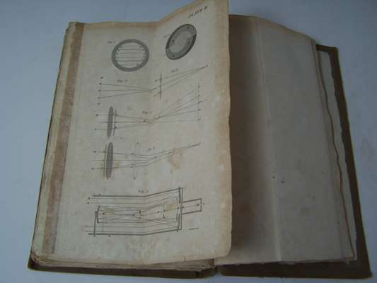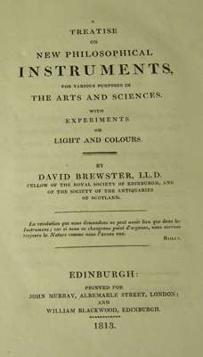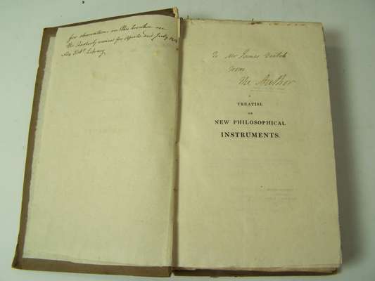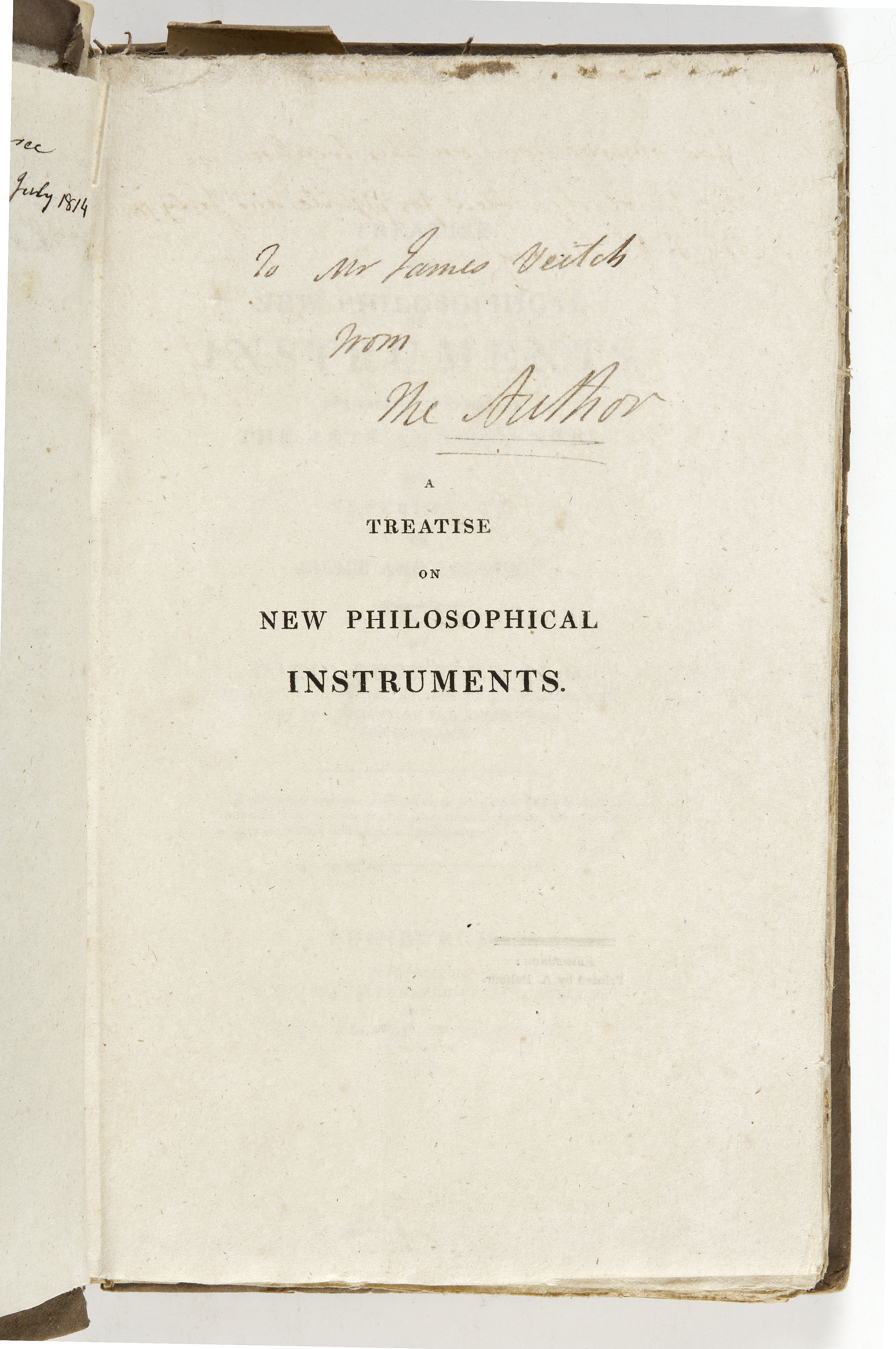 A treatise on new philosophical instruments. Edinburgh: J. Murray & W. Blackwood, 1813. First edition, presentation copy inscribed "To Mr James Veitch from the Author", 8vo, half-title, 12 folding engraved plates, original boards, uncut, with Veitch's note on endpaper "for observations on this treatise see the Quarterly Review, for April and July 1814", plates rather spotted, head of spine worn, joints partly cracked