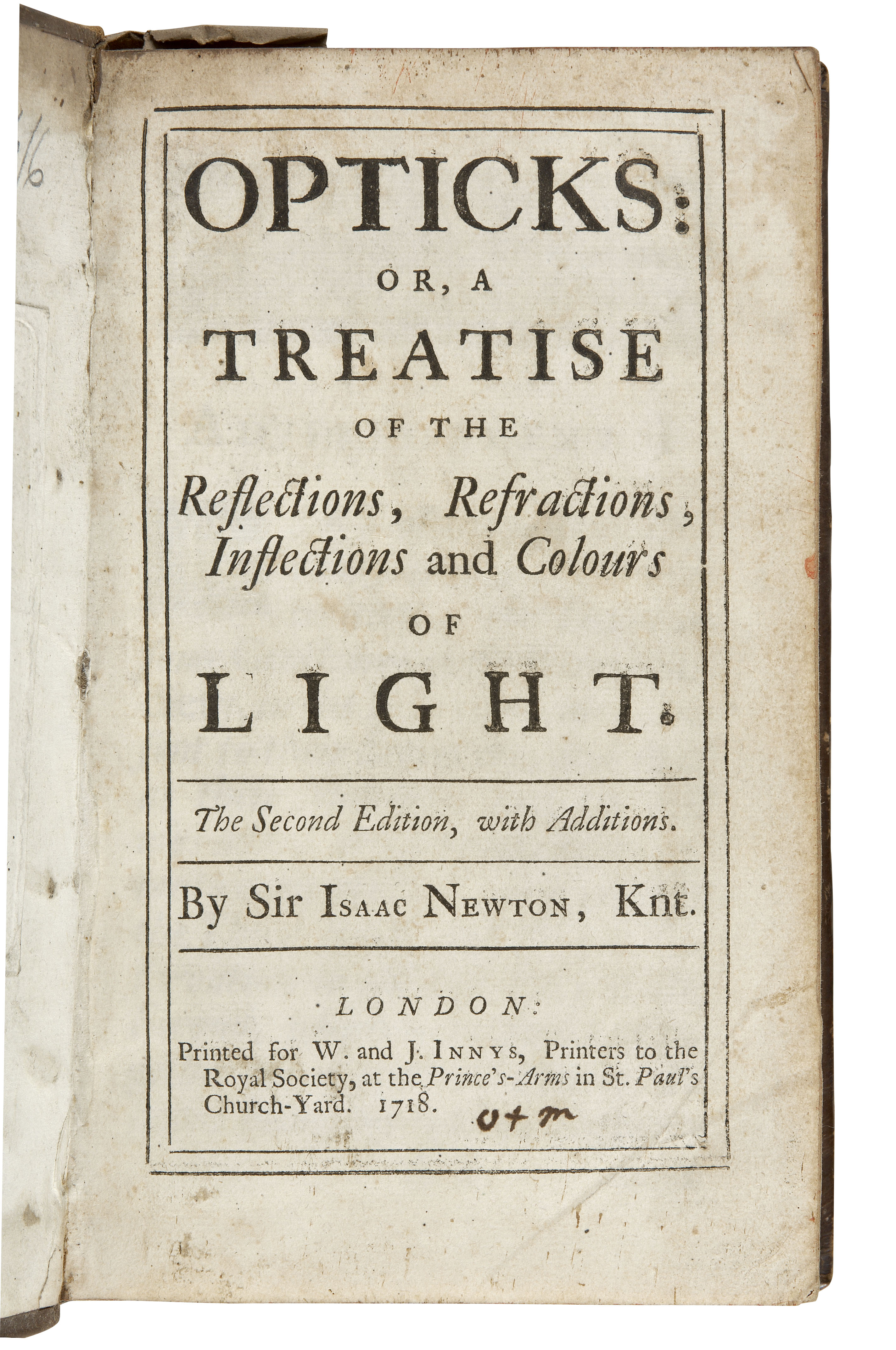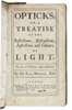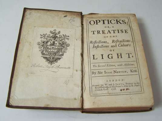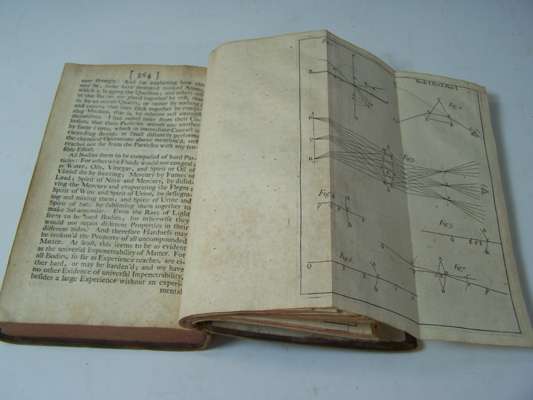Opticks. London: W. & J. Innys, 1718. Second edition, 8vo, [8], 382, [2], 12 folding plates, 1 advertisement leaf at end, contemporary calf, rather spotted, lacking front free endpaper, rubbed, joints split at head, 3 letters in ink on title