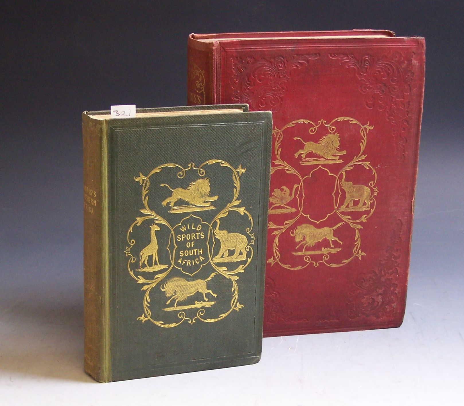 The wild sports of Southern Africa. London, 1852. Fifth edition, 8vo, folding map, vignette title, 25 colour plates, original red decorative cloth gilt, rebacked using original backstrip, later endpapers, some light foxing to interior; [Idem] The wild sports of Southern Africa. London, 1839. First edition, 8vo, half title, folding map, 7 plates, original decorative cloth gilt, rebacked using original backstrip, some foxing to interior; Bland-Sutton, J. Man and beast in Eastern Ethiopia. London: Macmillan, 1911. 8vo, presentation inscription from the author on title, illustrated in text, original red cloth gilt, gilt stamp of bucking wildebeast on upper board, fading to backstrip (3)
