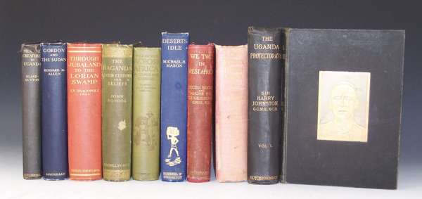 The Uganda protectorate. London, 1902. 8vo, 2 volumes, frontispiece, original blue cloth gilt, rubbed at edges, bookplate of the Signet Library; Bland-Sutton, Sir John Men and creatures in Uganda. London, 1933. 8vo, original blue cloth gilt, some fading to backstrip, chipped at head of spine; Roscoe, Sir John The Baganda. London, 1911. 8vo, frontispiece, original cloth gilt, ink inscription on front endpaper, binding rubbed; Mukasa, Ham Uganda's Katikiro in England. London, 1904. 8vo, frontispiece, original red cloth gilt, backstrip faded, ownership inscription; Statham, Colonel J.C. With my wife across Africa by canoe and caravan. London, [no date]. 8vo, original green cloth gilt, a clean copy; Oswald, Felix Alone in the sleeping-sickness country. London, 1923. Second edition, 8vo, frontispiece, original blue cloth gilt, some fading to backstrip; Falconer, J.D. On horseback through Nigeria. London, 1911. 8vo, original red cloth gilt, heavily faded, frontispiece loose; Moore, Decima We two in West Africa. London, 1909. 8vo, frontispiece, original red cloth gilt, rebacked; Allen, Bernard Gordon and the Sudan. London, 1931. 8vo, frontispiece, original blue cloth gilt; Mason, Michael H. Deserts idle. London, [no date]. 8vo, presentation copy from author, frontispiece, original blue cloth, some fading to backstrip; Dracopoli, I.N. Through Jubaland to the Lorian swamp. London, 1914. 8vo, frontispiece, original orange cloth gilt, some ink annotations; and 16 others (28)