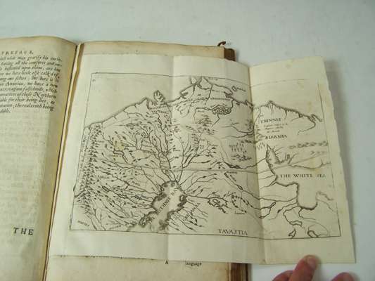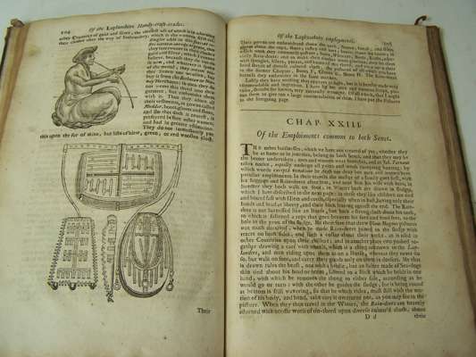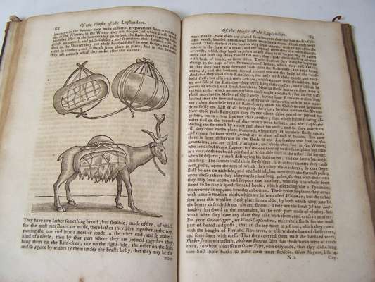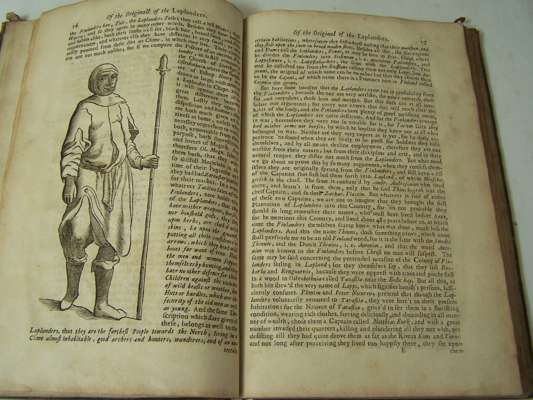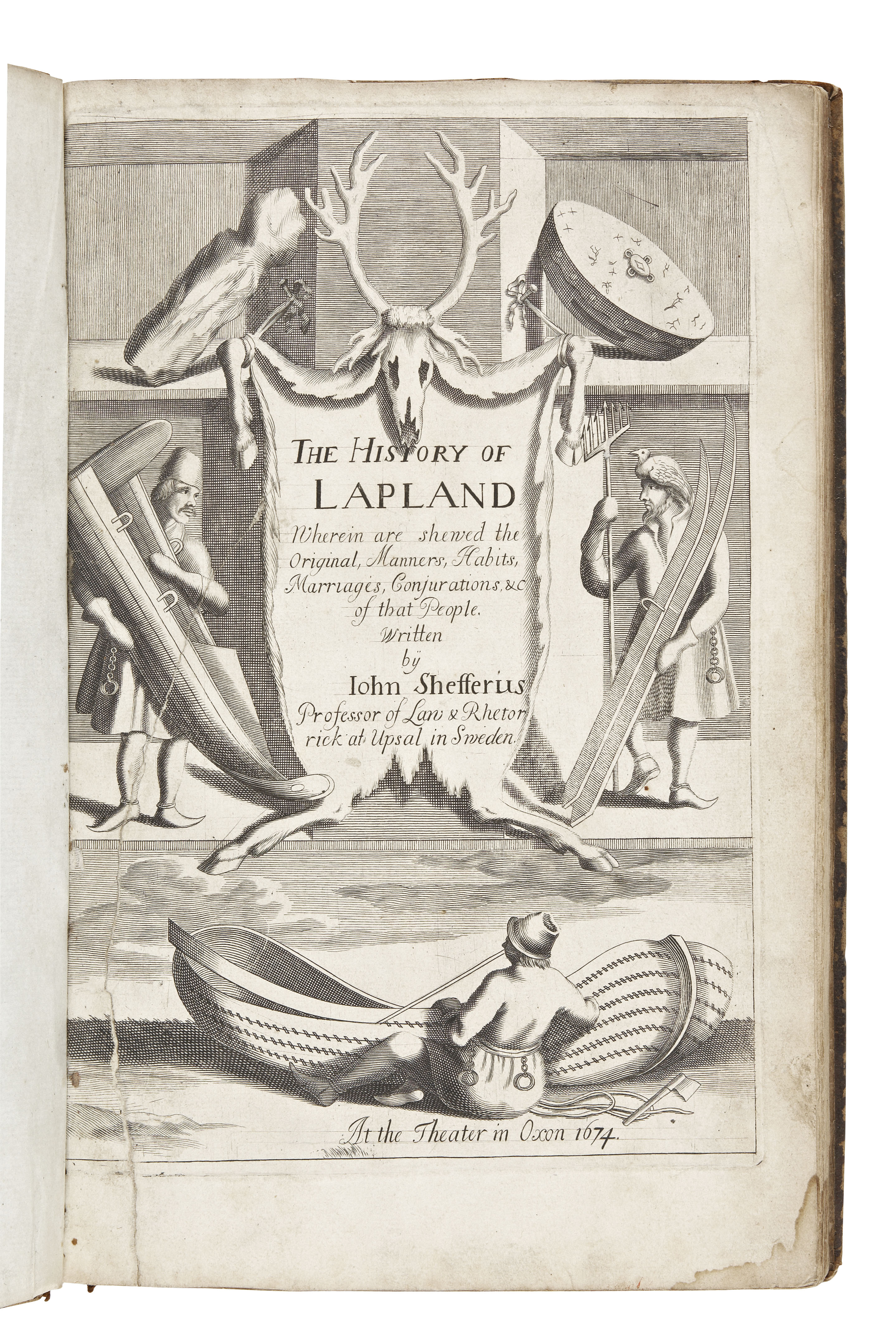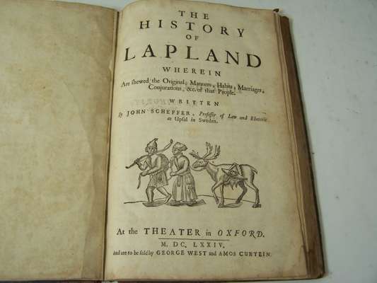 The history of Lapland. Oxford: Theater, 1674. Folio, engraved frontispiece torn without loss and laid down, folding engraved map, woodcuts in the text, corners rubbed, short split to lower joint, N2 and Z2 torn without loss, slight damp-staining in extreme lower corner, [Wing S-85l]