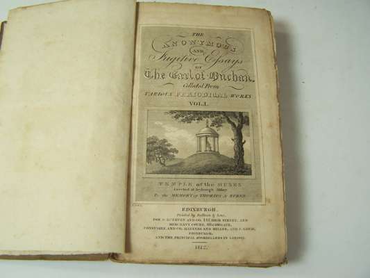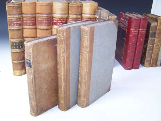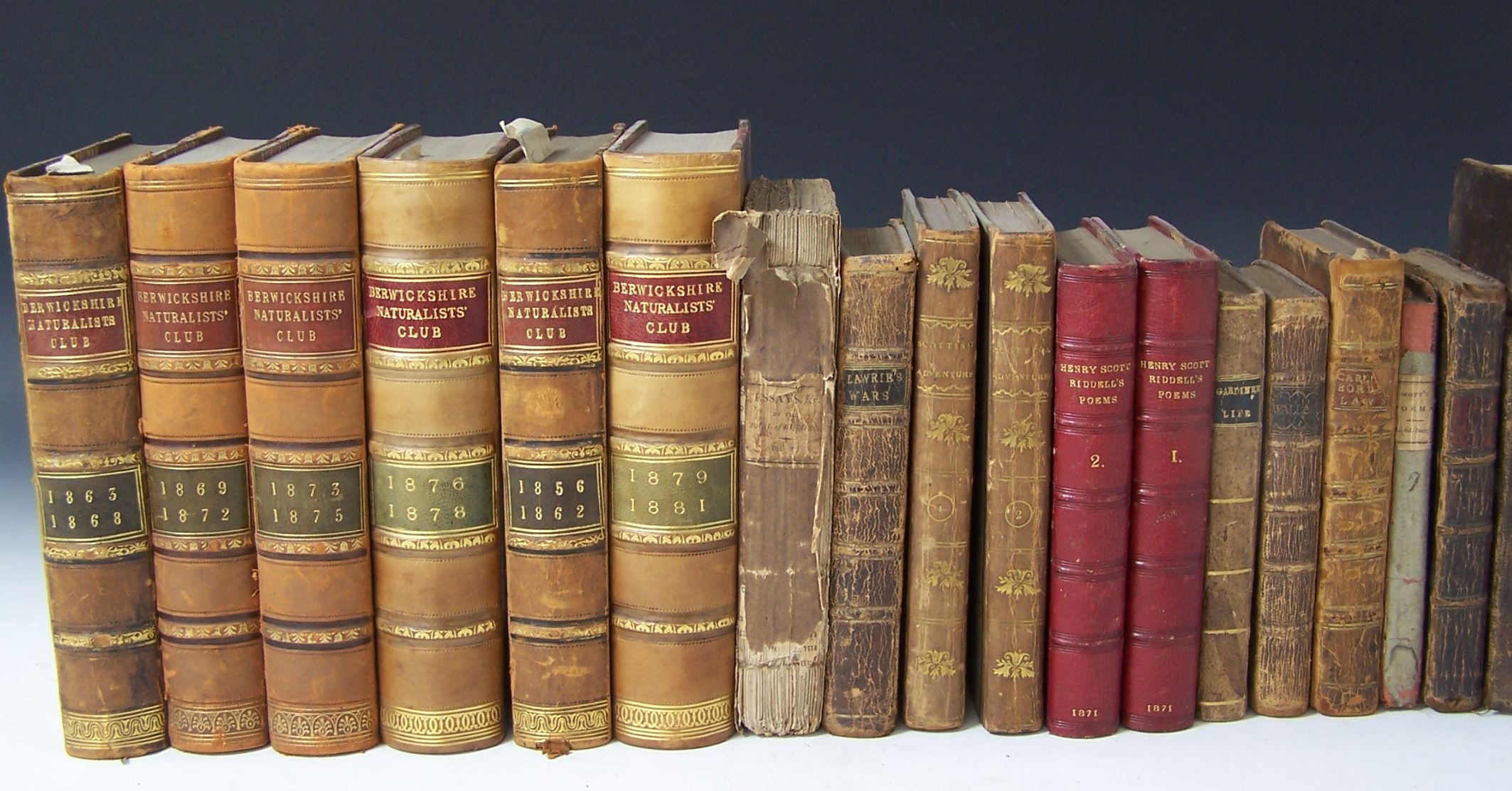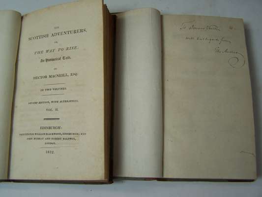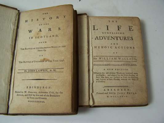 The Scottish adventurers. Edinburgh: W. Blackwood, 1812. Second edition, 2 volumes, 12mo, contemporary half calf gilt; [Erskine, D..S., 11th Earl of Buchan The anonymous and fugitive essays. Edinburgh: J. Ruthven, 1812. Volume 1 only, presentation copy "To Mr Veitch a self taught ingenous artist & philosopher from the Earl of Buchan", engraved title, original boards, uncut; Lawrie, John The history of the wars in Scotland. Edinburgh: W. Daling, 1783. 12mo, contemporary calf; Riddell, H.S. The poetical works. Glasgow: M. Ogle, 1871. 2 volumes, 12mo, red half morocco; Doddridge, P. Some remarkable passages in the life of the Honourable Col. James Gardiner. London: S. Crowder, 1791. 12mo, contemporary calf; The life and surprising adventures... of Sir William Wallace. Aberdeen: J. Boyle, 1774. 12mo, contemporary calf, some soiling; Lord, William, Bishop of Carlisle Leges marchiarum, or border-laws. London: Hamilton & Balfour, 1747. 12mo, contemporary calf; Scott, Andrew Poems chiefly in the Scottish dialect. Jedburgh: for the author, 1821. 12mo, engraved portrait, original boards, uncut, rubbed; Berwickshire Naturalists Club History 1856-1881. Alnwick, 1863-82. 6 volumes, 8vo, numerous plates, contemporary half calf gilt, four spines lightly rubbed; and 3 others (19)