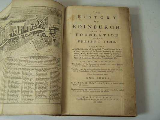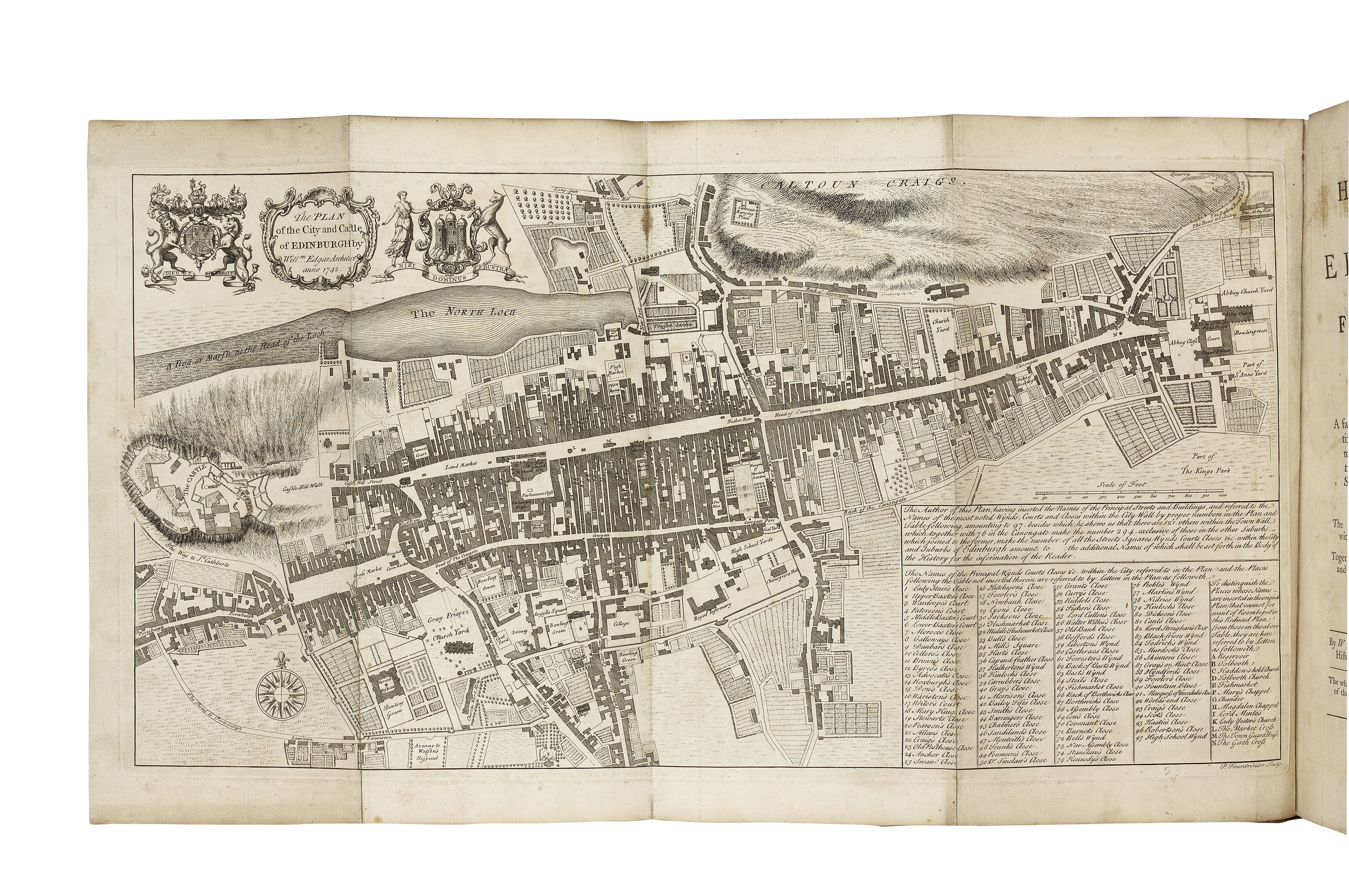 The history of Edinburgh from its foundation to the present time. Edinburgh, 1753. First ediiton, folio, folding map, 20 original plates, approximately 10 additional items bound in including an additional folding map, plates, & newspaper articles, later panelled calf, rebacked, some neat repairs to folding plates