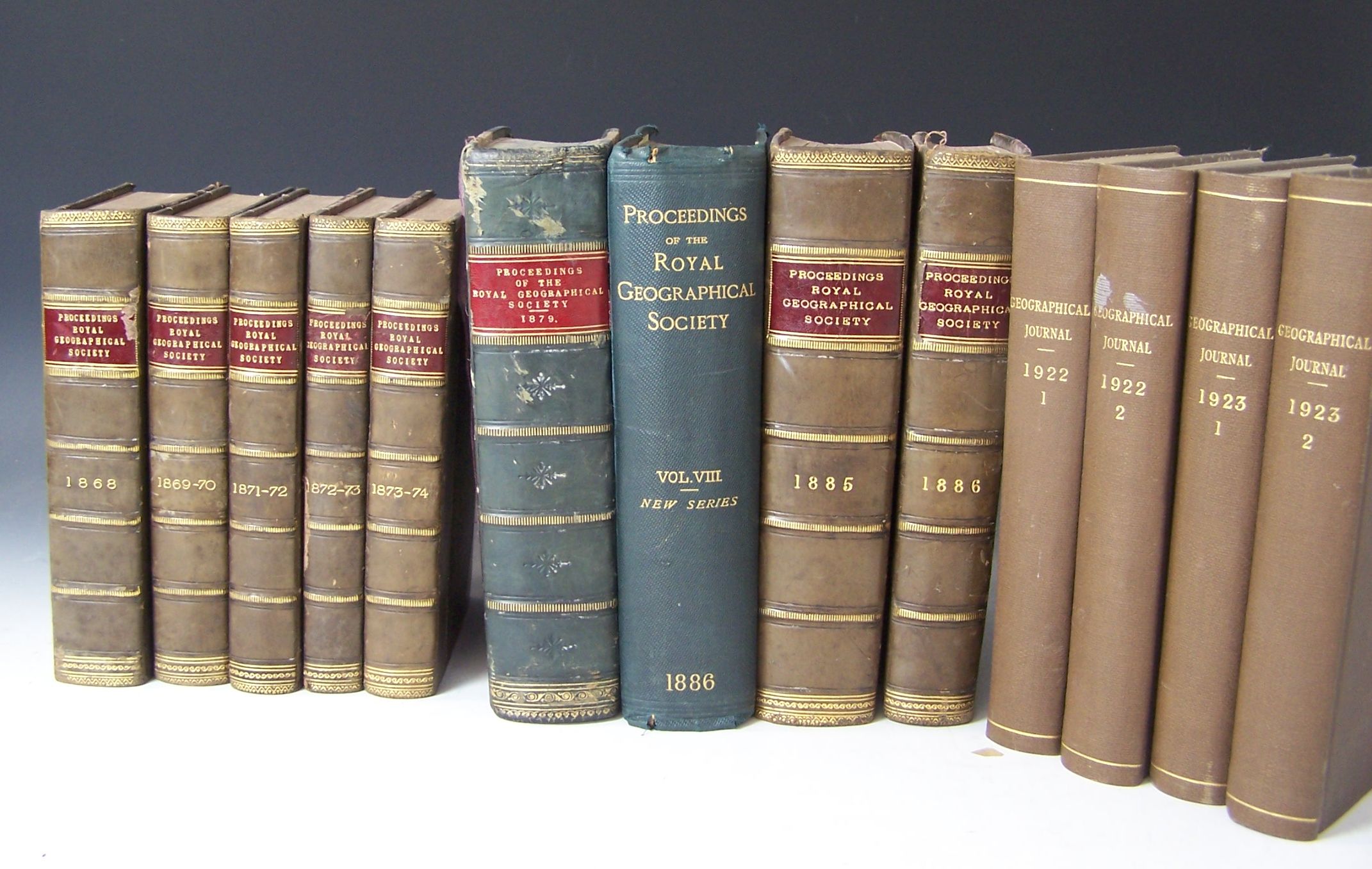 Proceedings. volumes 14 & 16-18, New Series volumes 1, 7 & 8, 1868-1886; Journal of the R.G.S. Volumes 38, [1868], 44 [1874], 46 [1876]; [continued as The Geographical Journal] Volumes 5 [1895], 25 [1905], 29 [1907], and a run from volume 59-113 [1922-1949], lacking volumes 64, 66, & 68; General Index to the Second Twenty volumes of The Geographical Journal 1903-1922, 8 volumes contemporary half calf gilt, 4 volumes original cloth, 49 volumes later brown cloth, a few volumes lightly rubbed; and 87 loose monthly issues (61 volumes, and 87 monthly issues)