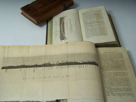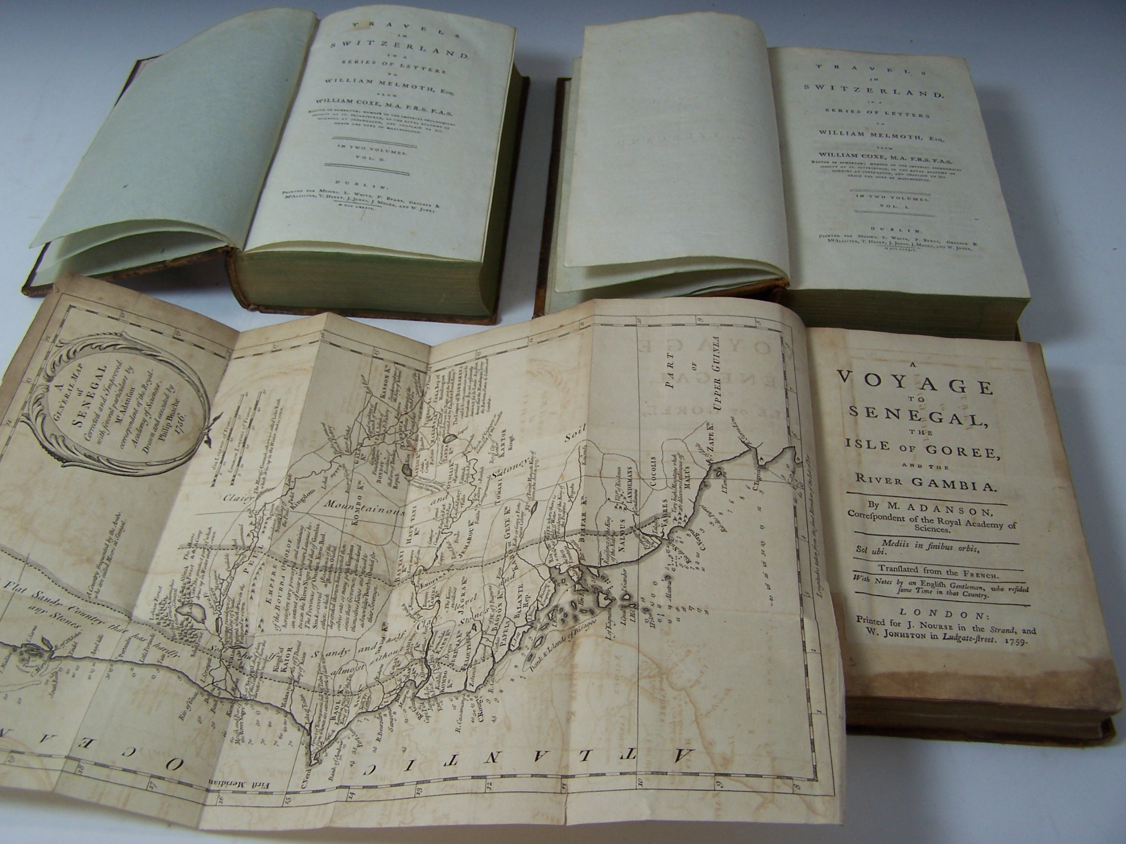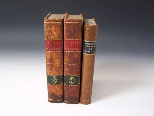 A voyage to Senegal, the Isle of Goree, and the River Gambia, translated from the French. London: J. Nourse & W. Johnston, 1759. First English edition, 8vo, folding engraved map, contemporary calf, neatly rebacked, black morocco lettering piece, some offsetting to map; Coxe, William Travels in Switzerland. Dublin: L. White, 1789. 2 volumes, 8vo, 5 engraved plates, contemporary tree calf, red morocco labels, slightly rubbed, lacks 2 maps (3)