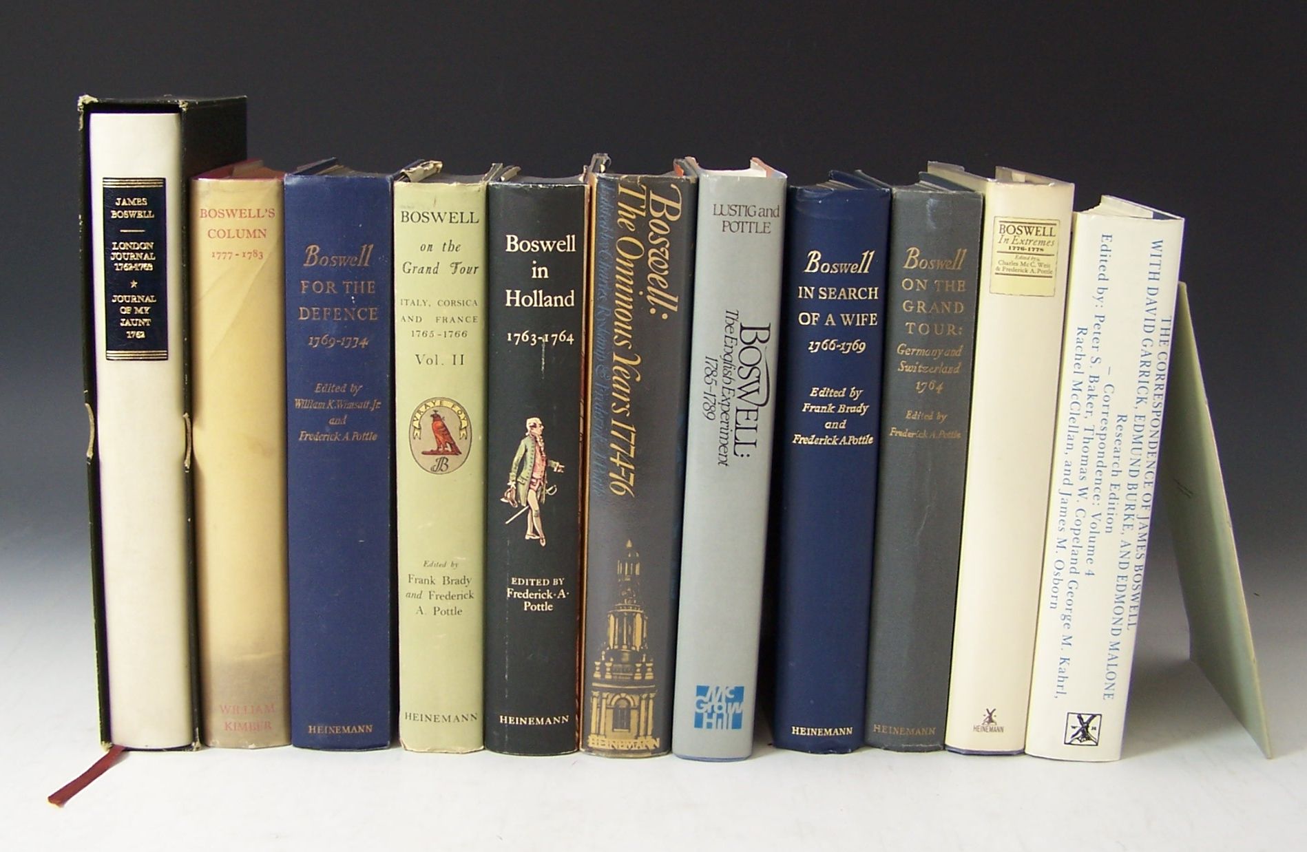 A collection of the Yale editions of The private papers of James Boswell, to include London journal 1762-1763 together with journal of my jaunt harvest 1762. London, 1951. Deluxe edition, number 849 of 1050 copies, frontispiece, original vellum backed cloth gilt, slipcase; Boswell's column 1777-1783. London, 1951. First edition; Boswell for the defence 1769-1774. London, 1960. First edition, lacking wrapper; Boswell on the Grand Tour... London, 1955. First edition; Boswell in Holland 1763-1764. London, 1952. First edition; Boswell in extremes 1776-1778. London, 1971; Boswell on the Grand Tour: Germany and Switzerland 1764. London, 1953. First edition, lacking dustwrapper; Boswell in search of a wife 1766-1769. London, 1957. First edition, lacking dustwrapper; Boswell the ominous years 1774-76. London, 1963. First edition; Boswell: the English experiment 1785-1789. London, 1986; The correspondence of James Boswell with David Garrick... London, 1986. Research edition, correspondence volume 4; all 8vo, original cloth gilt, dustwrapper; and a pamphlet on Boswell (12)