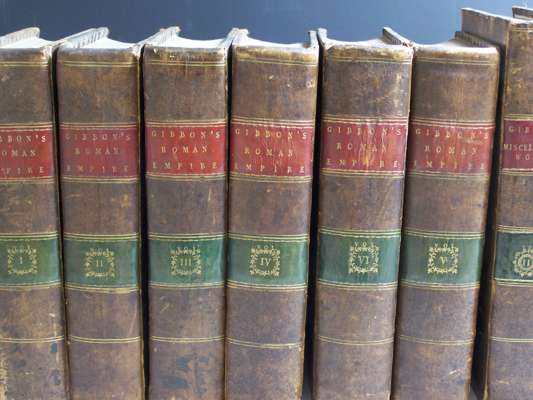 The history of the decline and fall of the Roman Empire. London: W. Strahan, 1776-1788. 4to, 6 volumes, first edition of volume I [second state with errata corrected on pp.183], second edition of volume II & III, portrait frontispiece to volume II, 3 folding maps, contemporary calf gilt, red and green labels, rubbed; [Idem] Miscellaneous works. London, 1796. 4to, 2 volumes, uniform with previous, upper board of volume II loose, some worming to first 2-3 leaves of volume I (8)