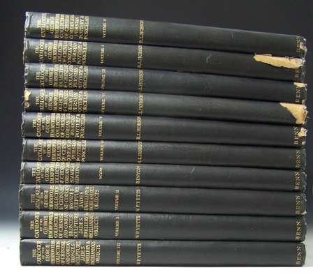 The George Eumorfopoulos collection. Hobson, R.L. Catalogue of the Chinese, Corean and Persian pottery and porcelain. 6 volumes; Yetts, W.P. Catalogue of the Chinese & Corean bronzes, sculpture, jades, jewellery and miscellaneous objects. 3 volumes; Binyon, L. Catalogue of the Chinese frescoes; Catalogue of the Chinese, Corean and Siamese paintings. London: E. Benn, 1925-32. Folio, limited to 725 copies, plates, some coloured, original black and gold cloth, uncut, some edge wear, five spines worn with loss, light finger soiling to some leaves, half-titles slightly discoloured (11)