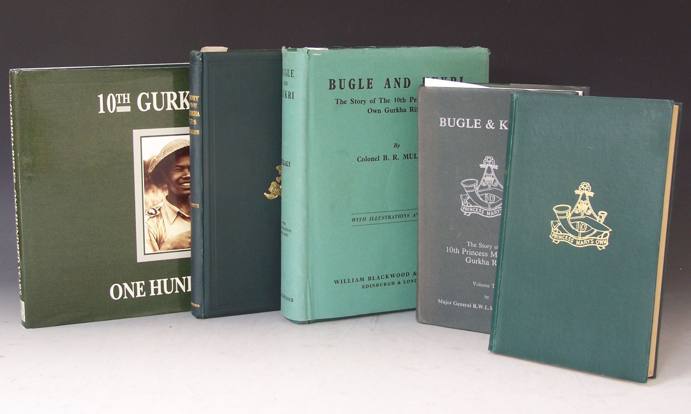 HIstory of the 10th Gurkha Rifles, the First Battalion 1890-1921. Aldershot, 1924. Large 8vo, plates and maps, original green cloth gilt; Mullay, Col. B. R. & McAlister, Maj. Gen. R.W.L. Bugle and Kukri, The story of the 10th Princess Mary's own Gurkha Rifles. Edinburgh, 1957-1985. 4to & 8vo, 2 volumes, plates and maps, original green cloth, dustwrappers; Bickersteth, Anthony Charles Odtaa, being extracts from the diary of an officer who served with the 4/10th Gurka Rifles... Aberdeen, 1953. 8vo, frontispiece, maps, original green cloth gilt; 10th Gurkha Rifles One hundred years. London, 1990. Oblong 4to, original cloth, dustwrapper, AMOT bookplate (5)