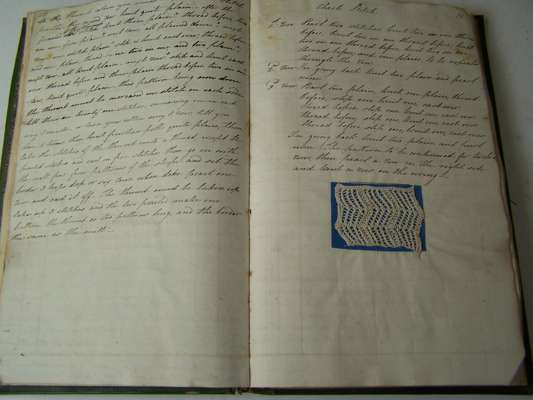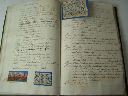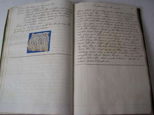 Manuscript, [c.1830]. 4to, 77pp., describing Single Jenny, Fancy Dutch, Check, Russian Van Dyke Pattern, Italian Stripe, Spot, Leaf, Winged, Fibre'd Leaf, Raised Diamond, Spider in Diamond, Wave and Jenny stitches & many other stitches, with examples of lace and embroidery pasted in, bound in green vellum