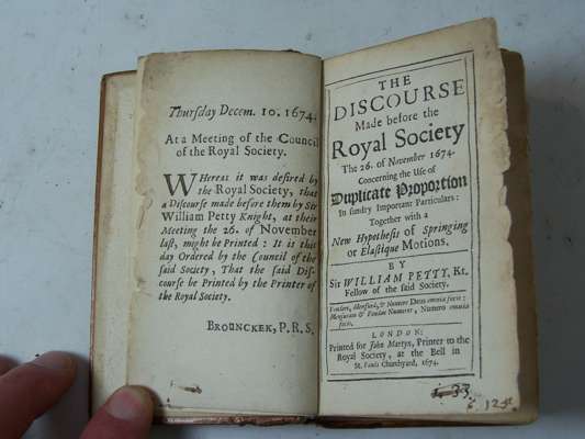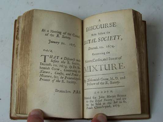 The discourse made before the Royal Society the 26 of November 1674. Concerning the use of duplicate proportion... together with a new hypothesis of springing or elastique motions. London: J. Martyn, 1674. 12mo, [32], 135pp., fore margin of first gathering slightly dampstained and extreme fore edge of few leaves slightly frayed; bound with Grew, Dr. Nehemiah A discourse made before the Royal Society, Decemb. 10 1674. Concerning the nature, causes and power of mixture. London: John Martyn, 1675. 12mo, [17], 120pp., eighteenth century calf, neatly rebacked, spine gilt