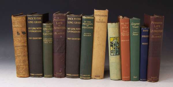 Missionary travels and researches in South Africa. London: John Murray, 1857. First edition, 8vo, folding frontispiece, plates, contemporary half caslf gilt, rubbed, lacking label; Crawford, Dan Back to the long grass. London, [no date]. 8vo, original black cloth gilt, some foxing and another copy; Dolman, Alfred In the footsteps of Livingstone. London, 1924. 8vo, colour frontispiece, plates, original green cloth gilt; Hetherwick, Rev. Alexander The romance of Blantyre. London, [no date]. 8vo, plates, original green cloth gilt; Campbell, R.J. Livingstone. London, 1929. 8vo, frontispiece, original cloth, faded; Blaikie, William Garden The personal life of David Livingstone. London, 1880. 8vo, frontispiece, original brown cloth, spotted; and 19 others (26)