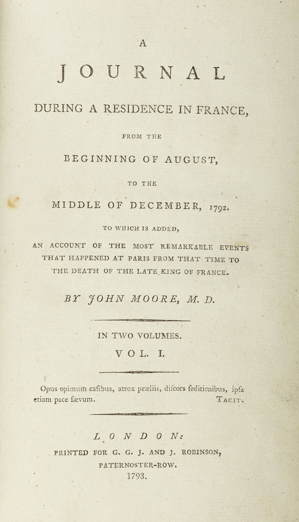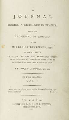 A journal during a residence in France from the beginning of August, to the middle of December 1792. London: printed for G. G. J. and J. Robinson, 1793. 8vo, 2 volumes, folding map, hand coloured in outline, contemporary blue morocco gilt, red labels, a.e.g., marble endpapers, interiors very clean (2)