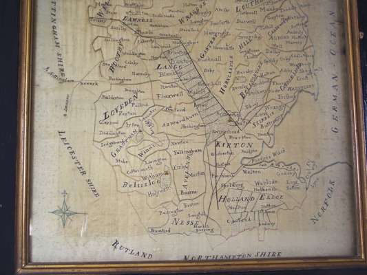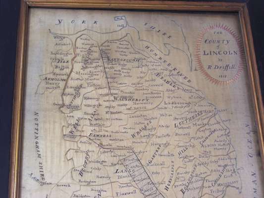 The county of Lincoln, by R. Driffill, 1818. 56 x 41cm., embroidered with parish borders, towns, roads and drainage canals, using different coloured silks, framed and glazed, some slight discolouration, very minor loss next to compass rose