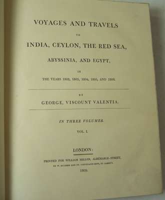Note: Lord Valentia travelled on a British mission from India to Abyssinia to secure a port on the Red Sea, accompanied by his secretary Henry Salt, after whose drawings the engravings were made. The first volume deals with India and Sri Lanka and volumes II-III cover Abyssinia and the Red Sea, including Mocha. Cf. Abbey, Travel 515 (note)