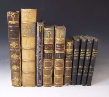 The history of the Orkney Islands. Edinburgh: Archibald Constable and Company, 1805. 4to, [viii, 509], folding map [torn and stained], 9 [of 11] plates, contemporary calf gilt, Northern Light Board gilt stamp on backstrip, Northern Light Board ink stamp to reverse of title, boards rubbed, upper board loose, foxing and staining thoughout; Reid, John T. Art rambles in Shetland. Edinburgh, 1869. 8vo, plates, original blue decorative cloth gilt, Northern Lighthouse inscription on front endpaper, some pages loose; Garnett, T. Observations on a tour through the Highlands and part of the Western Isles of Scotland. London: printed for John Stockdale, 1811. 4to, 2 volumes in 1, 52 plates, lacking folding map of Scotland, 19th century half calf gilt, Northern Light Board stamp on backstrip, bookplate of James Nairne, foxing [mainly to text leaves]; and 7 others (10)