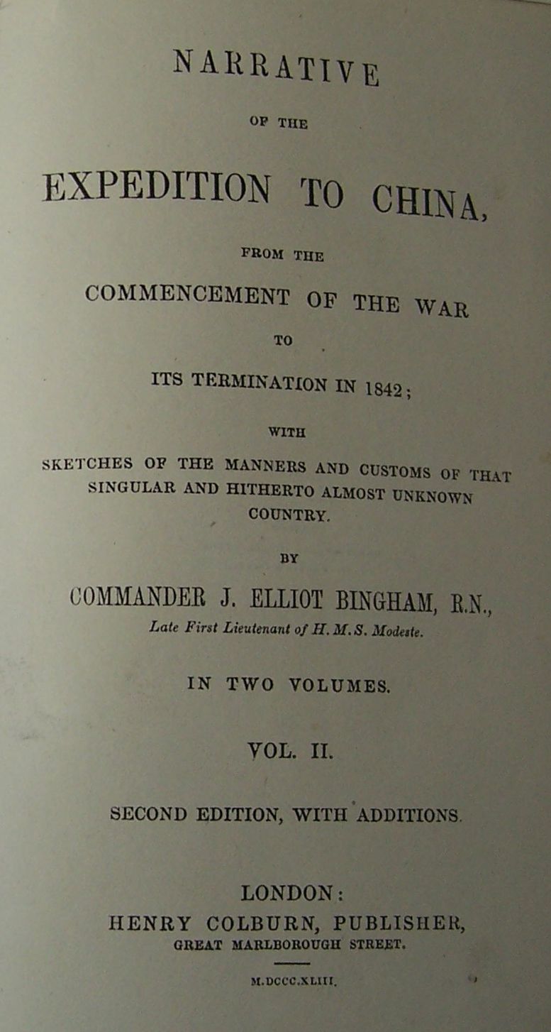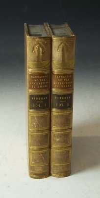 Narrative of the expedition to China... London: Henry Colburn, 1843. Second edition, 12mo, 2 volumes, [[xvi] 426; vi 446], frontispiece, 3 plates and one map, 19th century calf gilt, red and black labels, Northern Light Board gilt stamp to backstrips, lacking advertisements, slightly rubbed