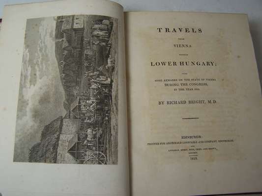 Travels from Vienna through Hungary. Edinburgh: Archibald Constable, 1818. First edition, 4to, [xviii, 642, cii, errata], vignettes, 10 plates, folding table, 2 folding maps [partly hand coloured in outline], contemporary half calf gilt, Northern Light Board gilt stamp, upper hinge cracking, some foxing, offsetting from plates