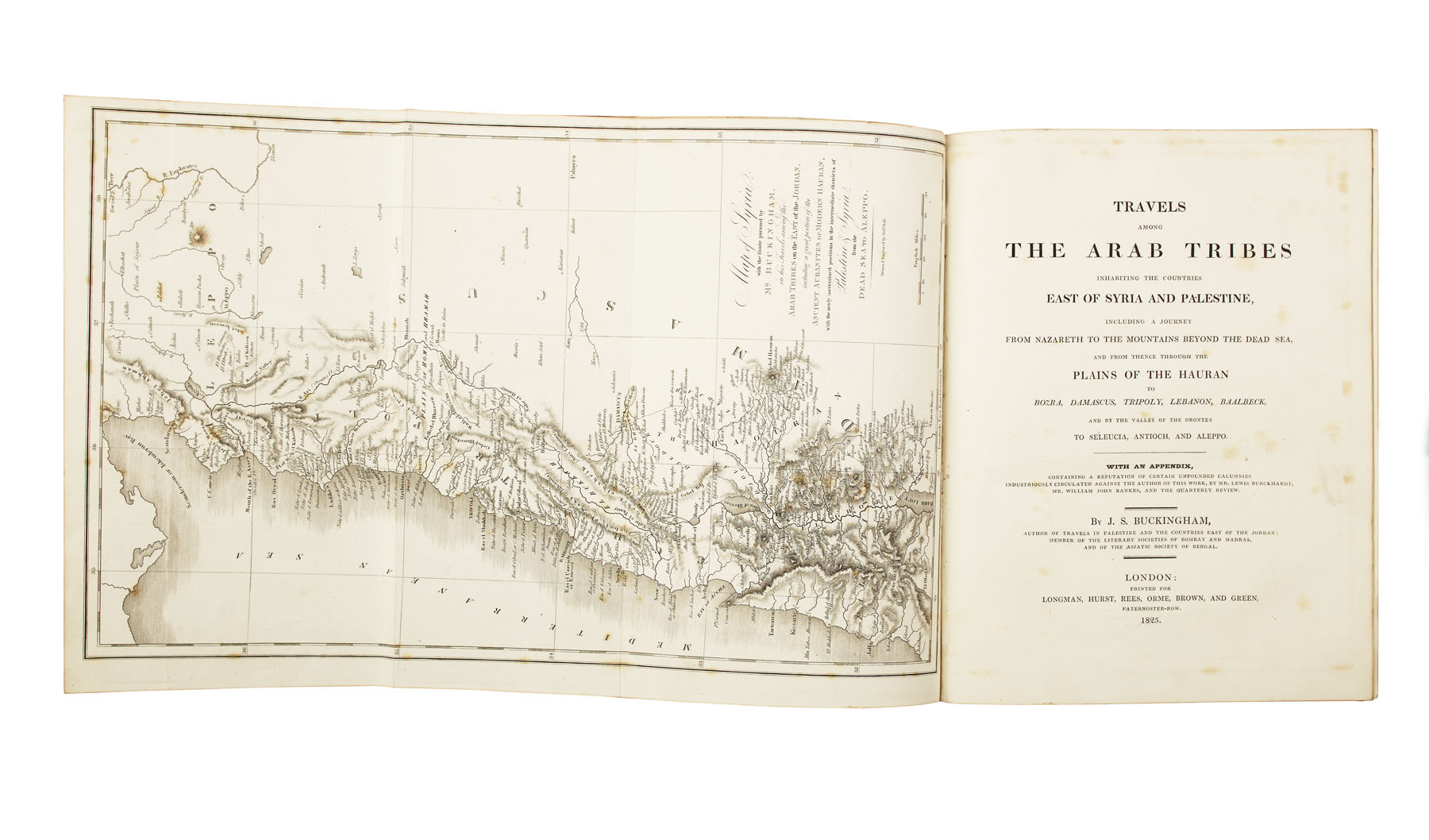 Travels among the Arab tribes inhabiting the countries East of Syria and Palestine. London: Longman, Hurst &c., 1825. 4to, [xvi, 679], folding engraved map, wood-engraved vignettes, contemporary calf, spine gilt, Northern Light Board gilt stamp at head of spine, map slightly offset onto title