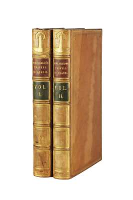 Travels in Arabia. London: Henry Colburn, 1829. Second edition, 8vo, 2 volumes, xxi, [3] 452; iii, [1], 431, 5 folding maps, all maps linen backed, 19th century calf gilt, red and green labels, Northern Light Board gilt stamp on backstrip, some light foxing to maps, offsetting to pages opposite maps
