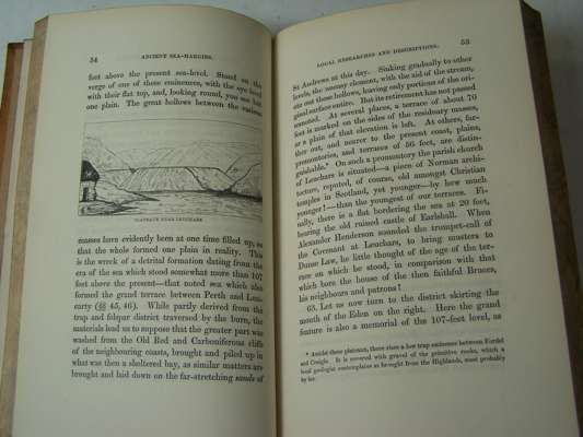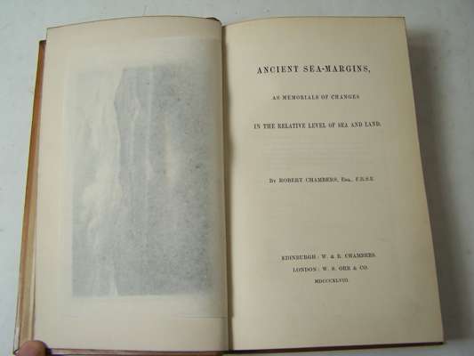 Ancient sea-margins, as memorials of change in the relative level of sea and land. Edinburgh: W. & R. Chambers, 1848. First edition, 8vo, [iii-vi, 338], folding map, partly hand-coloured, laid down on linen, lithographed frontispiece, illustrations, contemporary calf, spine gilt, Northern Light Board gilt stamp on upper cover, lacks half-title