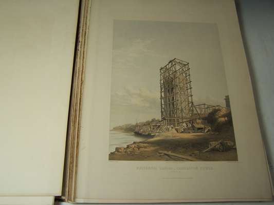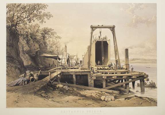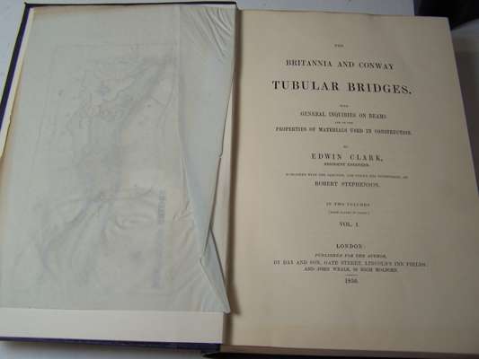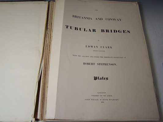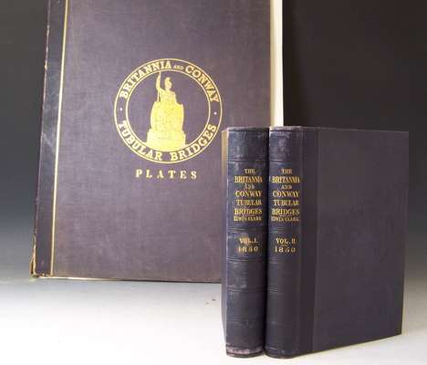 The Britannia and Conway tubular bridges. London: for the Author, 1850. First edition, 3 volumes including plate folio, 2 volumes large 8vo, [errata slip, xii, 466; viii, 467-822, iv list of subscribers], text with 18 engraved or lithographed plates, plate volume with 46 engraved or lithographed plates and plans [including plates 12 bis and 19 bis, and plate 40 & 41 combined on one sheet], several double-page, plates and text original quarter maroon morocco, spines gilt, plate volume with gutta percha perished and plates now loose, one plate with margin slightly frayed, head and foot of spine worn, plates clean