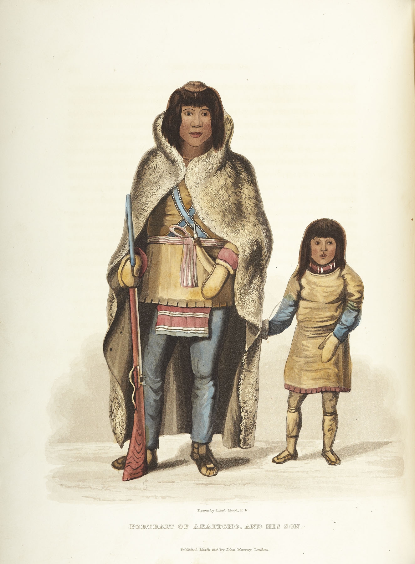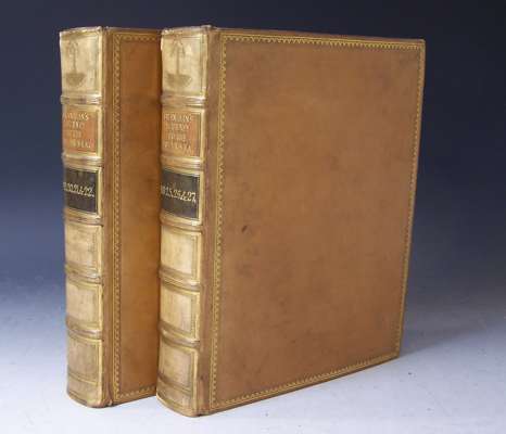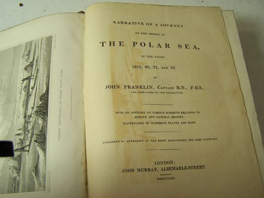 Narrative of a journey to the shores of the Polar Sea, in the years 1819, 20, 21 and 22. London: John Murray, 1823. First edition, 4to, [xv, 783, [1]], 31 engraved plates of which 12 are hand coloured, lacking the 4 maps at rear; [Idem] Narrative of a second expedition to the shores of the Polar Sea, in the years 1825, 1826 and 1827. London: John Murray, 1828. First edition, 4to, [xxiv, xxi-xxiv, 320, clvii, [2]], additional portrait frontispiece tipped in, 31 engraved plates, 7 folding maps at rear of which one is hand coloured in outline, errata at end; uniformly bound in 19th century calf gilt by Robert Seton, brown and black labels, marbled endpapers, Northern Light Board gilt stamp to backstrips, Northern Light Board stamp to reverse of titles, some small patches of rubbing to backstrips, some offsetting from plates (2)