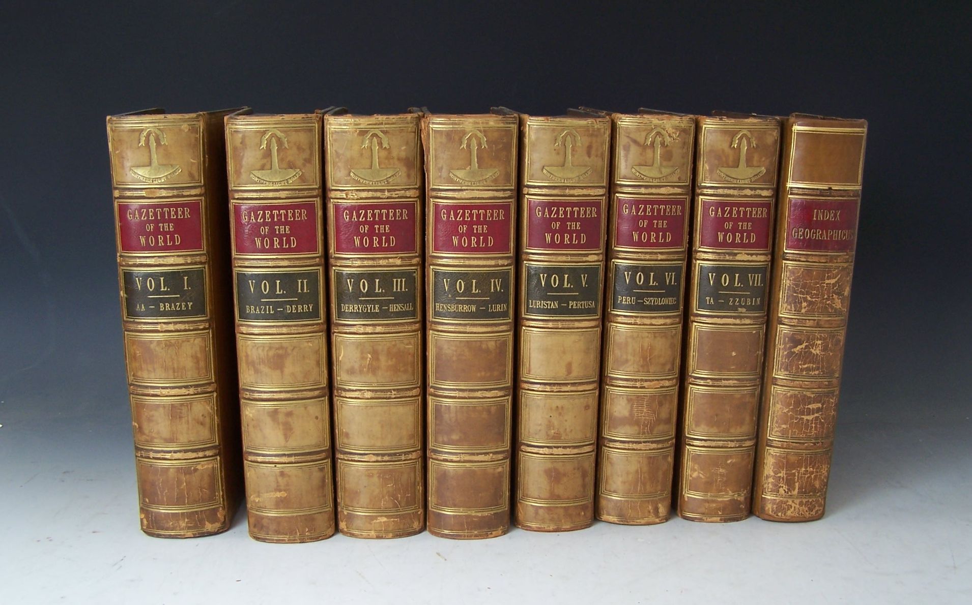 A gazetteer of the world. Edinburgh: A. Fullarton & Co., 1856. 4to, 7 volumes, plates and maps, maps coloured in outline, 19th century calf gilt, red and black labels, Northern Light Board gilt stamp to backstrips, rubbed at edges, hinges cracking; [Johnston, Keith] Index geographicus... Edinburgh, 1864. 4to, 19th century calf gilt, red label, rebacked. Sold not subject to return. (8)