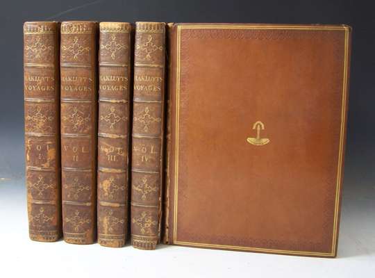 Collection of the early voyages, travels and discoveries of the English nation. London: R.H. Evans, 1809-1812. New edition, 4to, 5 volumes, one of 250 copies on royal paper, 19th century calf gilt, Northern Light Board gilt stamps on upper boards, marble endpapers, volumes I-II rebacked, hinges splitting on volume III & V, boards loose on volume IV, some foxing (5)