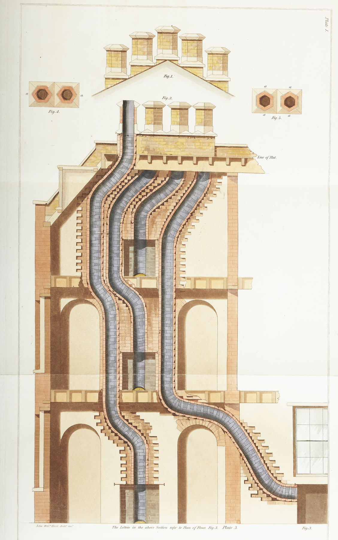 A practical treatise on the construction of chimneys. London: for the author, 1826. 8vo, author's signature to reverse of title, [viii, 58, 15, 8], 4 folding hand coloured plates, [bound with] Supplement to Mr. Hiort's treatise on the architectural construction of chimneys... and Note for the information of the public, 19th century calf gilt, "Engineer's Office" gilt stamp to backstrip, interior clean, some creasing to plate 2