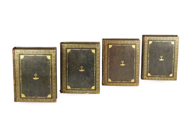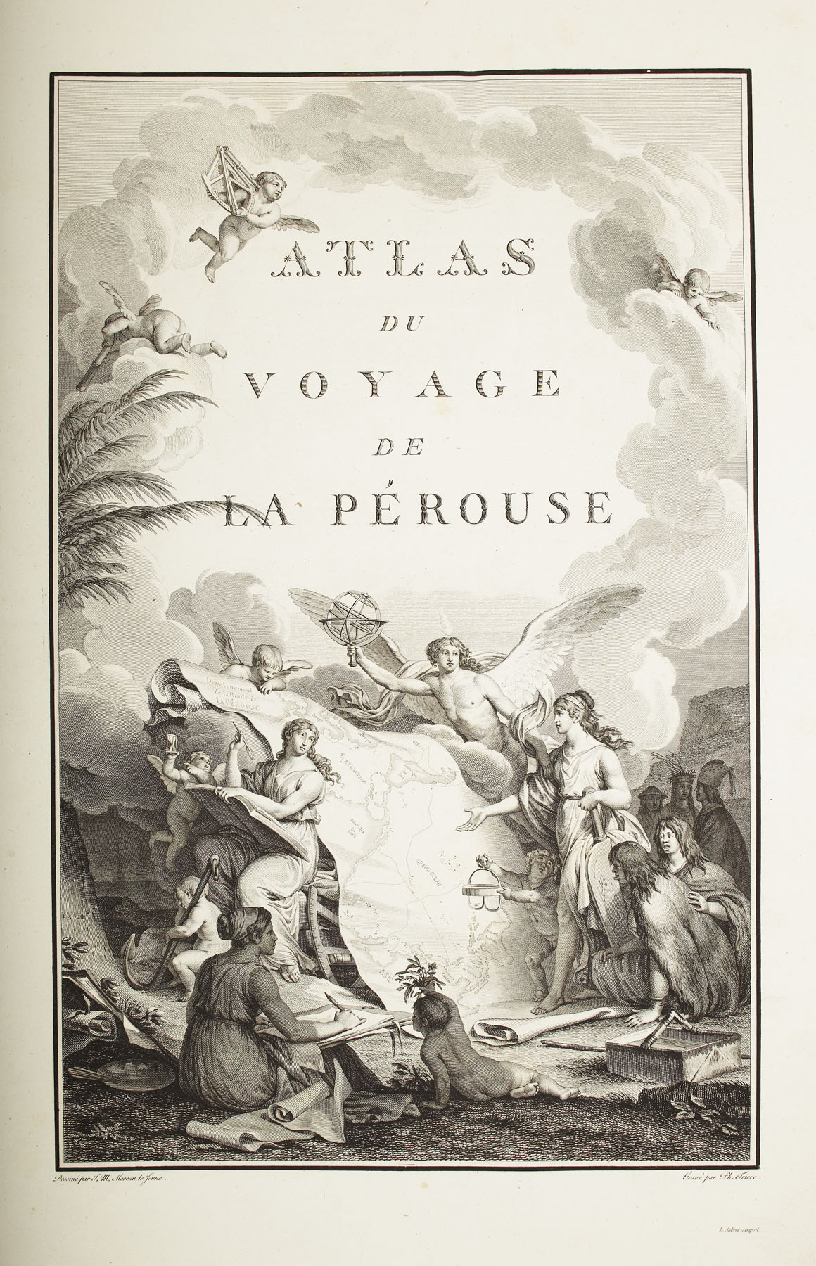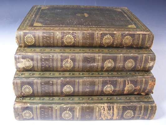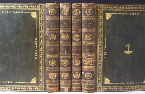 Voyage de La Pérouse autour du monde... rédigé par M.L.A. Milet-Mureau. Paris: l'Imprimerie de la République, 1797. First editions, 4 volumes, 4to [iv], 72, 346, [ii]; [iv], 398, [ii]; [iv], 422, [ii]; [iv], 309, and atlas folio, text with half-titles and engraved portrait in volume 1, atlas with engraved allegorical title and 69 engraved plates, charts and maps, some double-page, contemporary calf, gilt, text with Northern Lighthouse Board gilt stamp to upper boards, head and tail of spines and corners rubbed, crack to upper joint of volume 2, lower edge of upper board of volume 3 worn, slight worming to joints of volume 4, atlas with Northern Lighthouse Board gilt stamp at head of spine, worn, spine detached