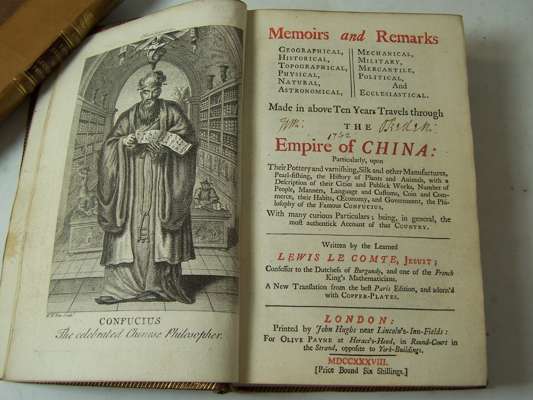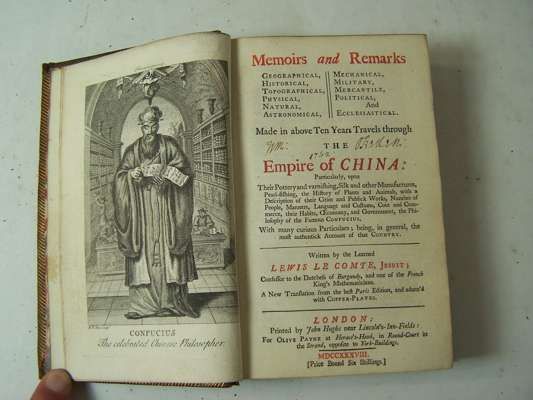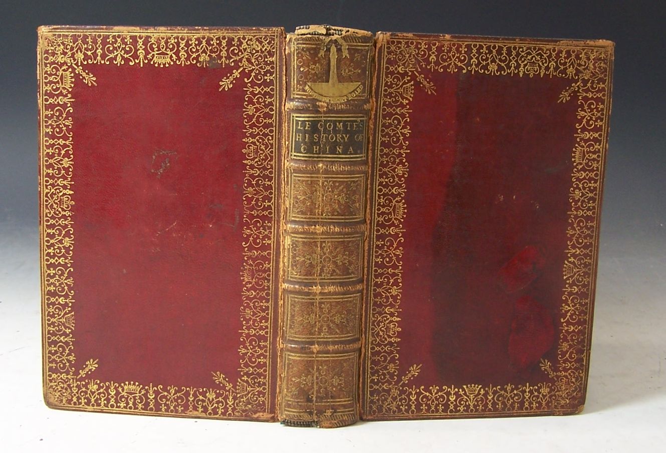 Memoirs and remarks, geographical, historical... made in ten years travels through the empire of China. London: O. Payne, 1738. 8vo, [viii, 536], 4 engraved plates, contemporary red morocco, Northern Lighthouse Board gilt stamp at head of spine, worn, joints split, blisters to upper cover