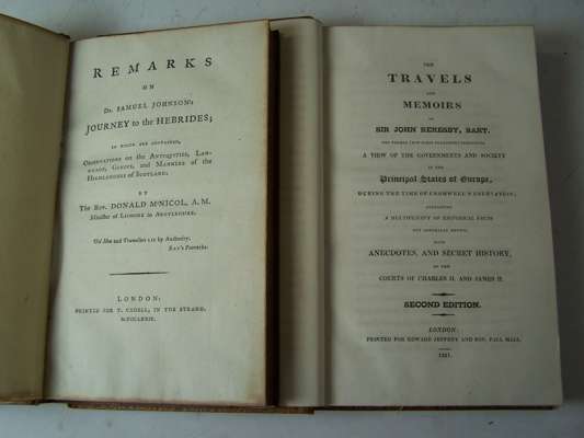 Remarks on Dr. Samuel Johnson's journey to the Hebrides. London, 1779. 8vo, [6], 371, [1], early 19th century calf gilt, Northern Lighthouse Board gilt stamp on board; Reresby, Sir John The travels and memoirs of... London, 1821. Second edition, 8vo, [xii, 414, [29]], 19th century calf gilt, Northern Lighthouse Board gilt stamp on backstrip (2)