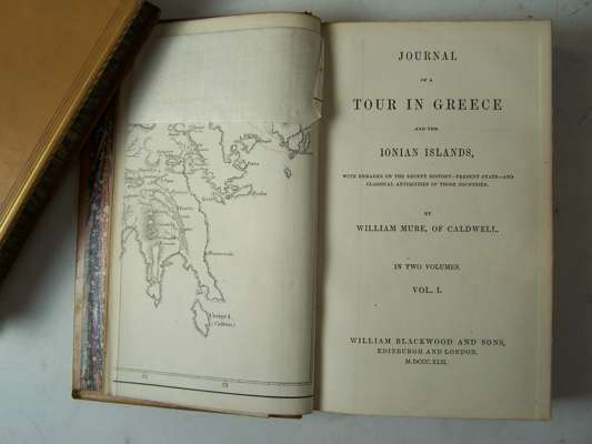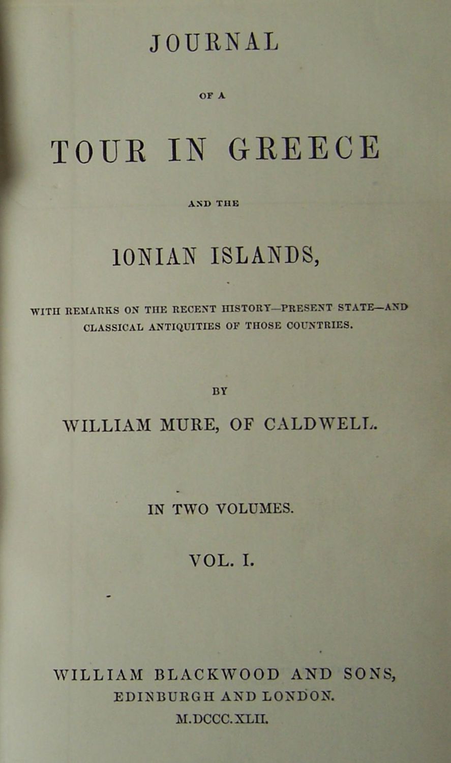 Note: "An interesting work" (Blackmer). Mure travelled in early 1838 visiting, inter alia, Corfu, Ithaca, Missolonghi, Delphi, Thebes, Athens, Sunium, Aegina, Corinth, Olympia and Patras. His principal work was A Critical History of the Language and Literature of Ancient Greece (1850-57). Blackmer 1170