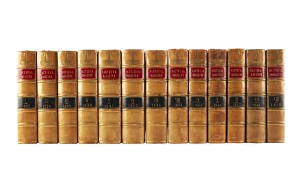 The nautical magazine and naval chronicle. London: Simpkin, Marshall & Co., 1837-1886. 8vo, 50 volumes, circa 173 maps and plates, 19th century half calf gilt, red and black labels, Northern Lighthouse gilt stamp to backstrips. Sold not subject to return. (50)