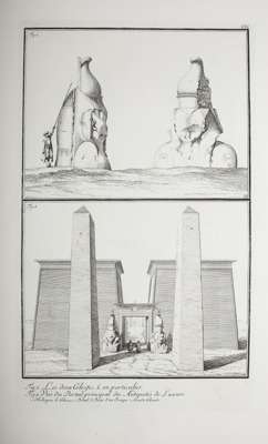Travels in Egypt and Nubia. London: Lockyer Davis and Charles Reymers, 1757. First English edition, folio [57 x 46cm], 2 volumes in one, half titles, allegorical frontispiece, portrait frontispiece, 159 maps & plates on 161 sheets, engraved head and tail pieces, early 19th century calf gilt, Northern Light Board gilt stamp to backstrip, upper board loose, some offsetting from plates, very occasional spotting