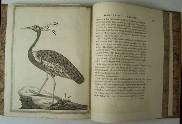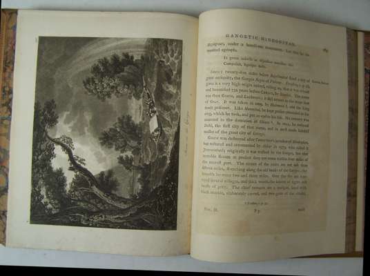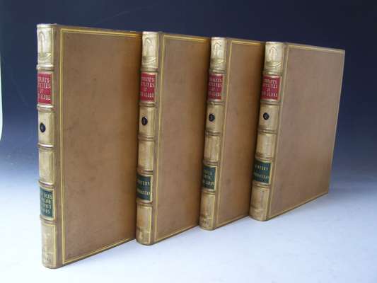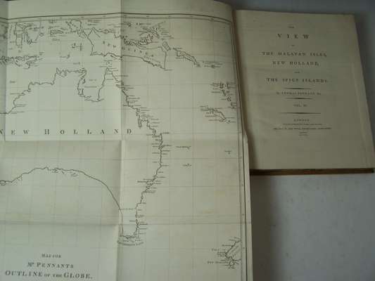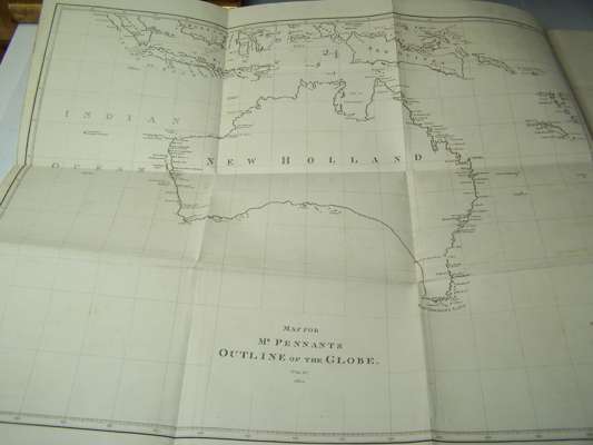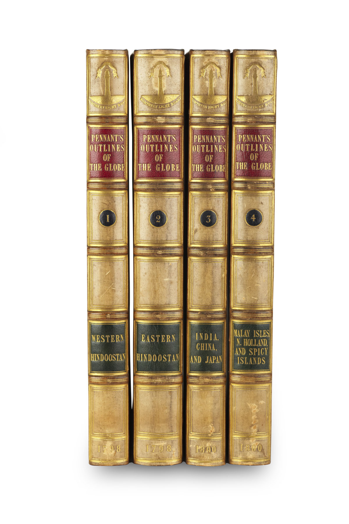 Outlines of the globe. London: Henry Hughs [John White], 1798-1800. 4 volumes, 4to, [ii], [xvi], 263, [ix]; [xii], 374, xiii; xvi, 284, xiii; [viii], 317, [xxii], 21 engraved plates, 2 engraved head-pieces, 3 folding maps laid down on linen, half-titles to all 4 volumes, some plates offset onto text, early nineteenth century calf gilt, spines gilt, Northern Lighthouse Board gilt stamp at head of spines, occasional spotting, blank leaf inserted at p.72 volume 4