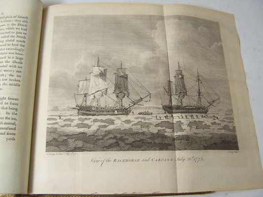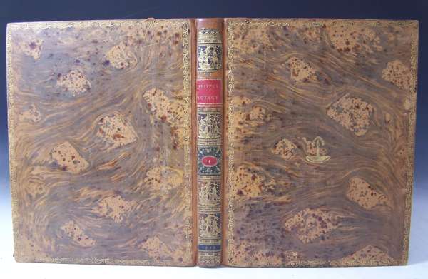A voyage towards the North Pole. London: W. Bowyer and J. Nichols for J. Nourse, 1774. First edition, 4to, [iii-viii, 253, [ii], 3 folding engraved charts, 12 folding plates, 11 folding printed tables, final leaf with directions to the binder, contemporary tree calf, spine gilt, Northern Lighthouse Board gilt stamp on upper board, lacks half-title, light discolouration to title, neatly rebacked retaining most of original spine
