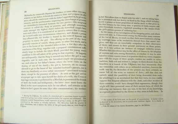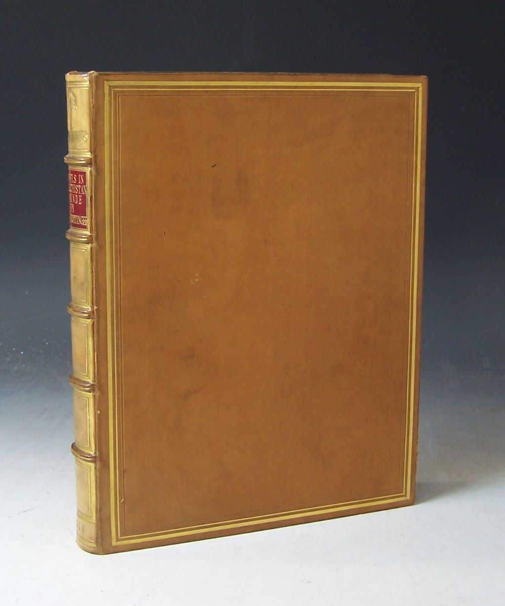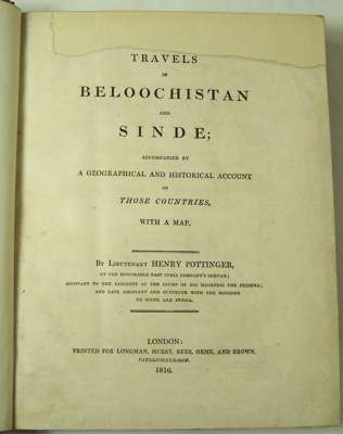 Travels in Beloochistan and Sinde. London: Longman, Hurst, Rees, et al., 1816. First edition, 4to, [xxx, 423], folding map, [linen backed], 19th century calf gilt by Robert Seton, Northern Light Board gilt stamp to backstrip, lacking frontispiece, large repair to title, leaf B creased