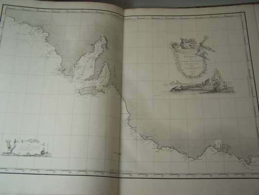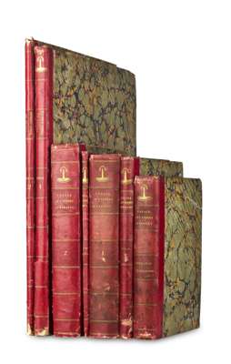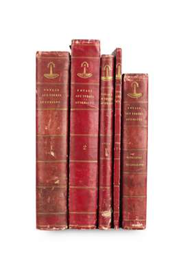 Freycinet, Louis Voyages de découvertes aux terres australes... Navigation et géographie. Paris: l'Imprimerie royale, 1815. 4to, [xvi, 576, [ii]; [with:] Atlas [Partie navigation et historique]. Folio, (565 x 447mm.), engraved title, 32 engraved charts, 25 double-page; Historique. Atlas, deuxieme partie. Paris, 1811. Folio (580 x 410mm.) Engraved title, 14 engraved charts, 2 double-page, mounted on guards, all contemporary quarter red morocco with marbled boards, Northern Light Board gilt stamp at head of spines, Northern Light Board stamp on verso of titles, bindings slightly rubbed and scraped, atlases worn at head and foot of spine, lower joint to 1st atlas partly split, clean horizontal tear to spine, light spotting to a few charts, intermittent foxing to text volumes (7)