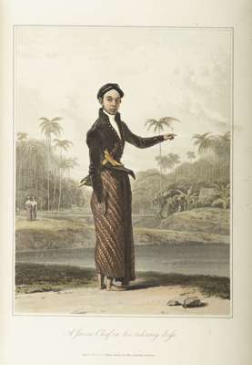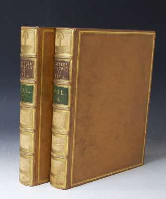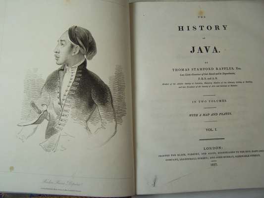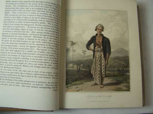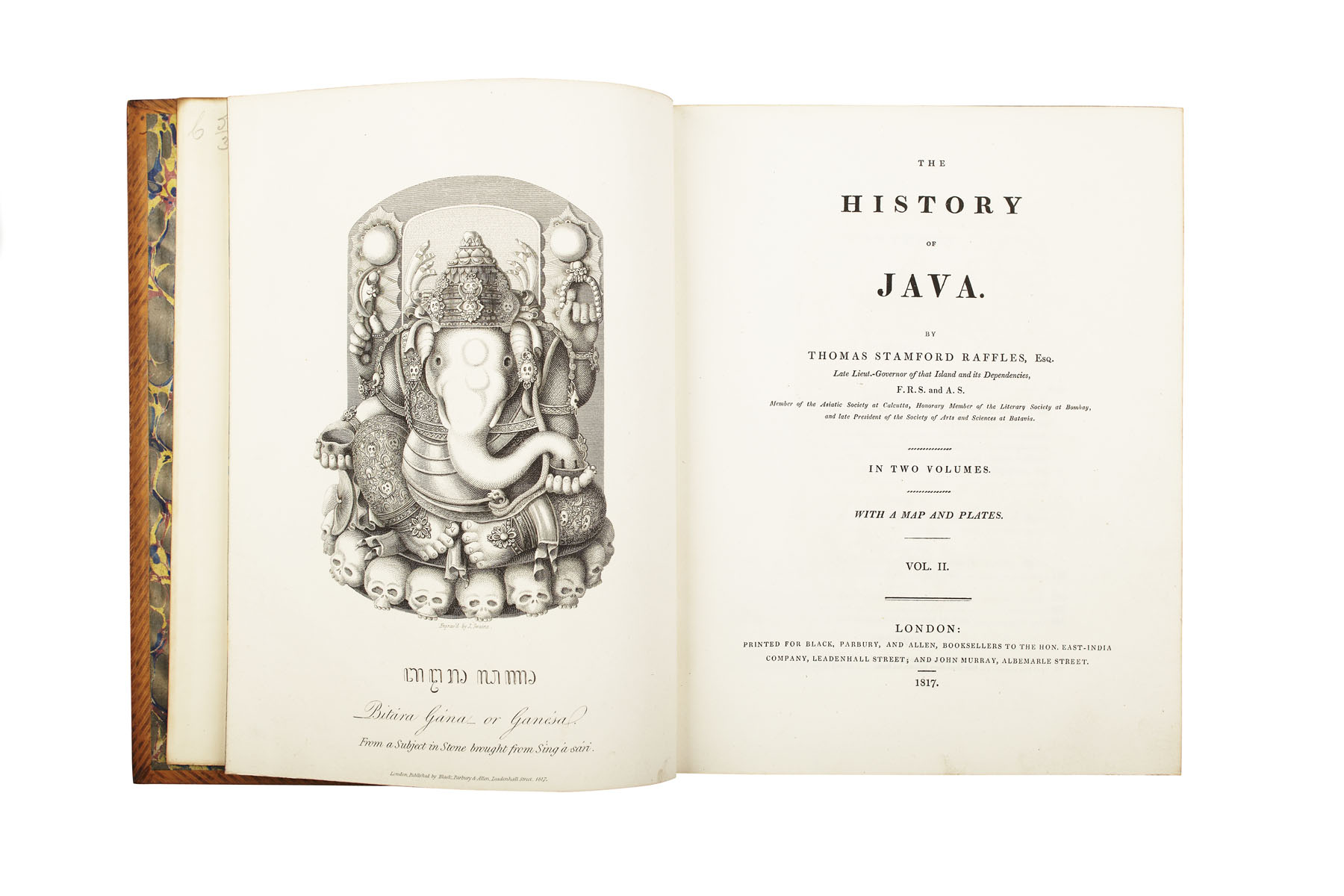 The history of Java. London: Black, Parbury & Allen, 1817. First edition, 2 volumes, 4to, [iii-xlviii, 479; iii-viii, 292, cclx], 1 folding map hand-coloured in outline and laid down on linen, 1 leaf of music [engraved verso and recto] and 63 plates (including 10 hand-coloured aquatints), 2 folding tables, engraved vignettes, nineteenth century calf gilt, Northern Lighthouse Board gilt stamp at head of spines, lacks half-titles, 2 folding tables and one plate laid down on linen
