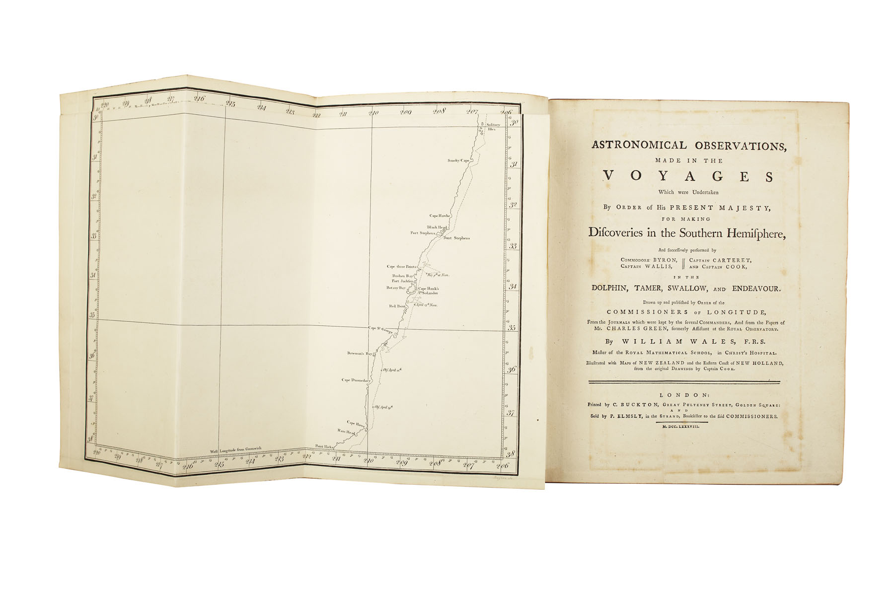 Astronomical observations made in the voyages... for making discoveries in the Southern Hemisphere. London: sold by P. Elmsley, 1788. 4to, [[iv], xii, *4, 146], 2 folding maps, contemporary tree calf gilt, red label, Northern Lighthouse Board gilt stamp to upper board, rubbing to backstrip, some offsetting to title
